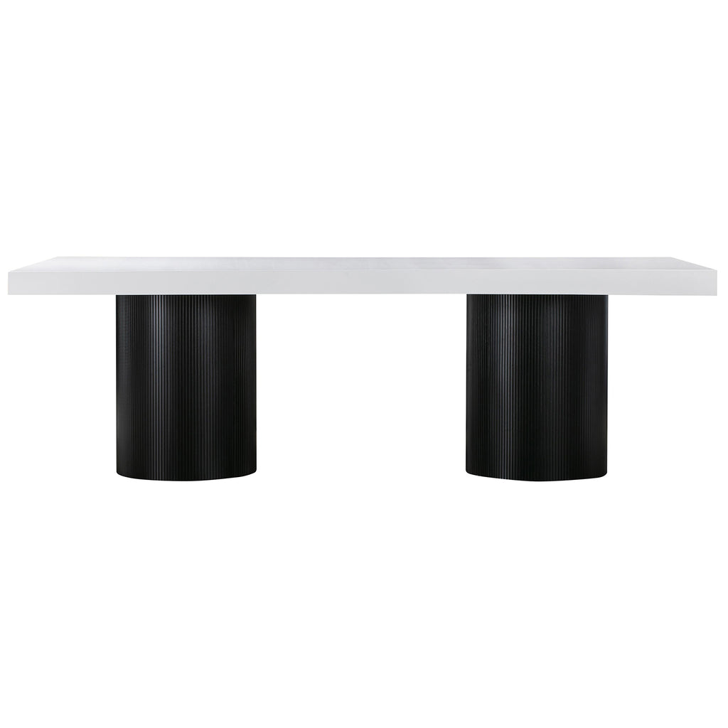 The clean-cut simplicity of the Nova Table with its statement conical legs, makes it the perfect bold yet versatile piece to elevate your dining experience. Featuring a glossy white lacquer top contrasted with 2 beautifully crafted black pedestal legs, this two-toned minimalistic table will undeniably be an accessory to any dining room.