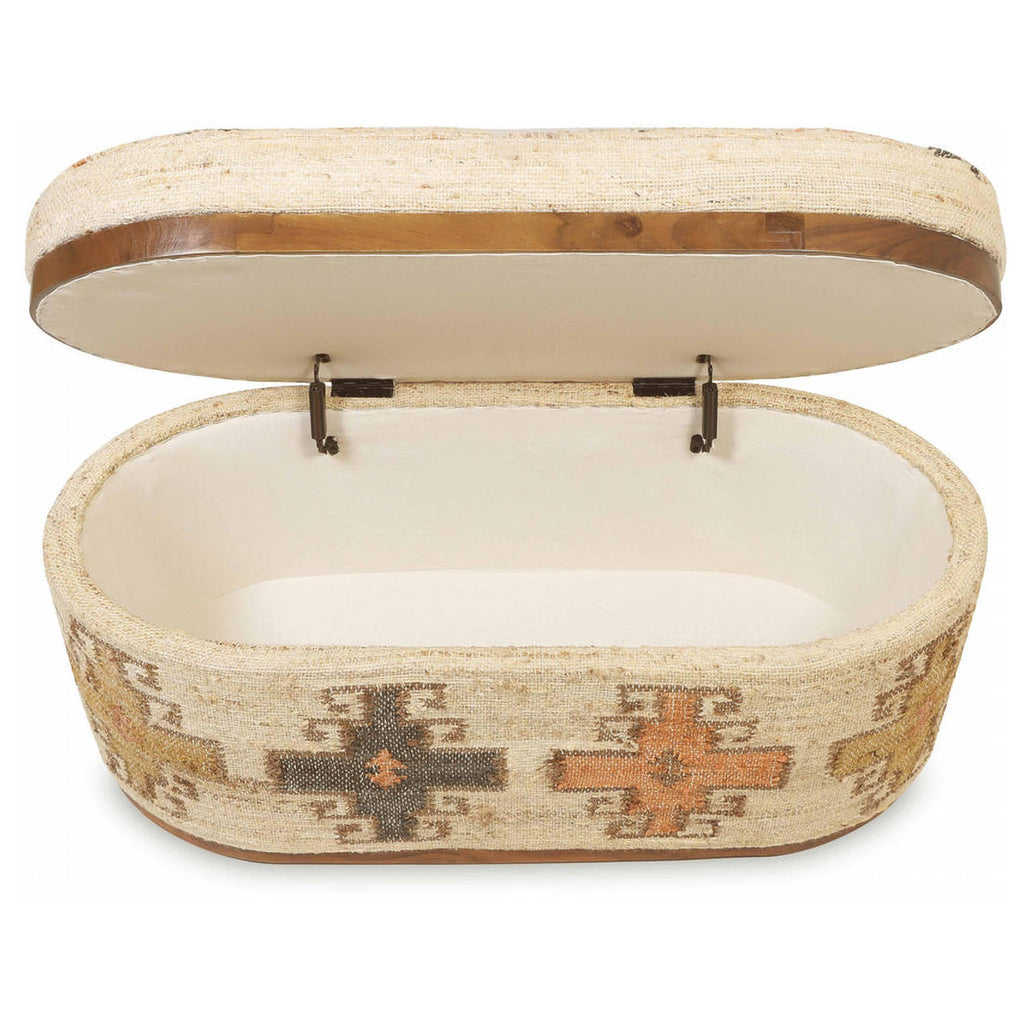 Add a textural touch to your living space with the versatile Olivier Oval Storage Ottoman, available in lush peach or ivory boucle or a captivating tribal cotton pattern. Featuring a tilting lid for convenient storage, this ottoman is wrapped in textured fabrics and accentuated with elegant acacia trim. The cotton option, adorned with a large tribal pattern in beautiful earthy tones, effortlessly enhances any space with its rich, bohemian flair, while the finished interior offers a refined touch.