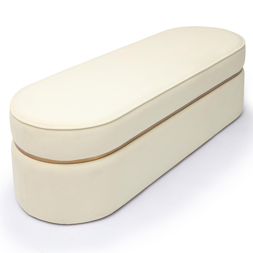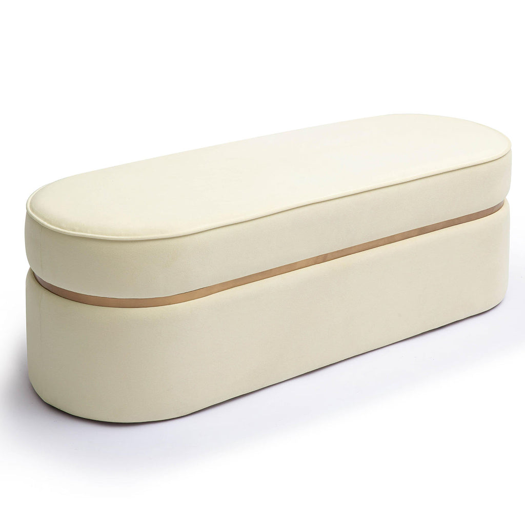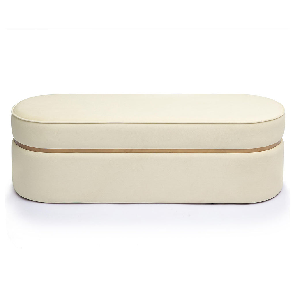 Indulge in the ultimate blend of luxury and comfort with the Pomp Velvet Bench, available in cream or honey, featuring high-density foam on top for a relaxing seating experience. A thin, gold stainless steel strip runs gracefully down the middle, adding an art deco touch that exudes understated glamour. Elevate any room's aesthetic with this timeless piece that's so in vogue right now.
