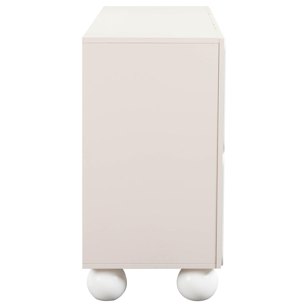 Steal the spotlight with the TOV Furniture Tori Motif Taupe Buffet, where a dynamic facade plays the lead role without overshadowing its practical brilliance. Behind the scenes, four discreet drawers offer a storage ensemble fit for the most discerning collector, all perched upon solid wood, spherical legs that bring a sculptural, Hollywood-esque flair. This buffet dazzles with a medium sheen that makes cleanup a breeze, paired with soft-close hinges that salute quality, and adjustable shelves that flex to fit your function with a dash of finesse.