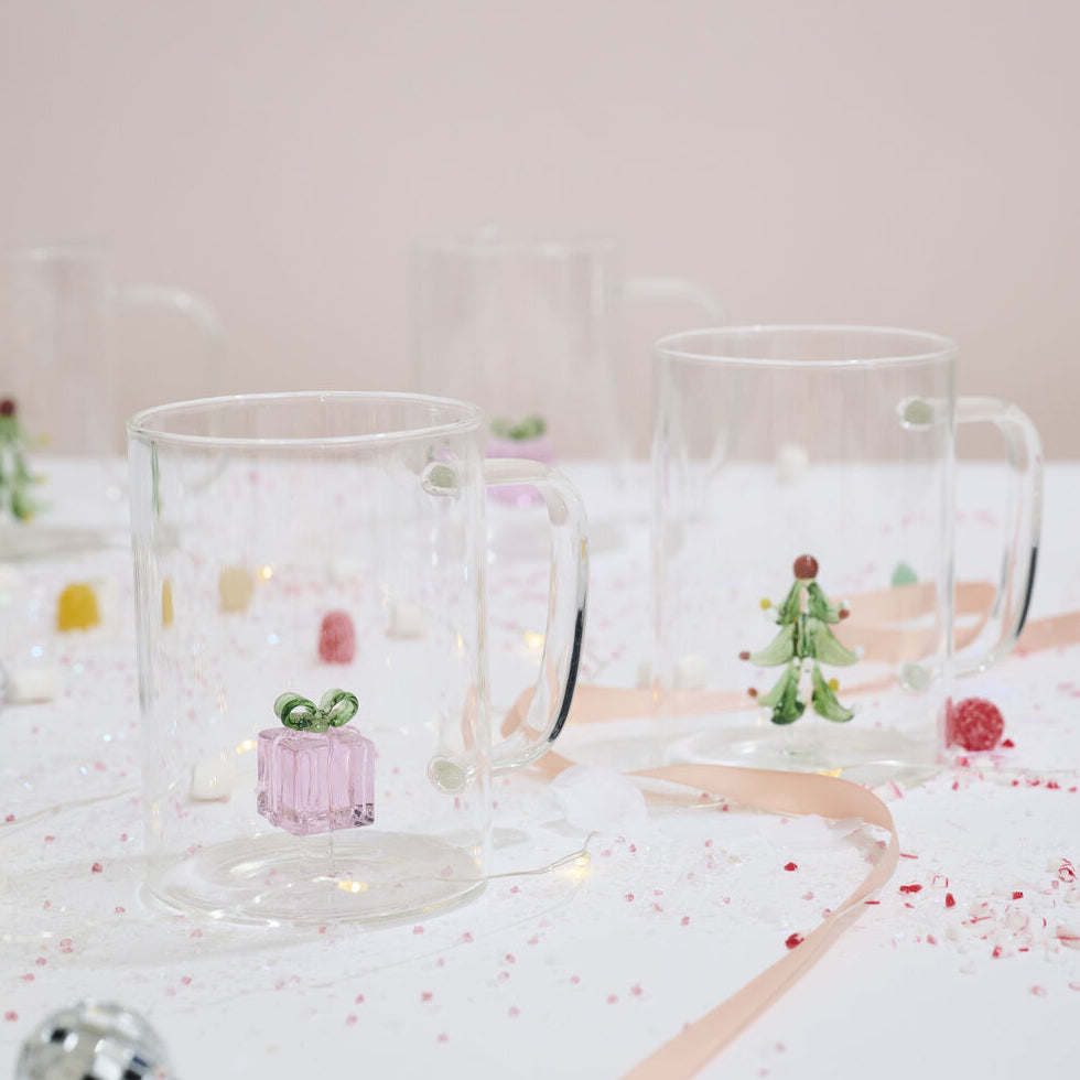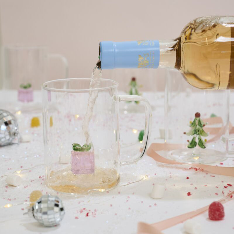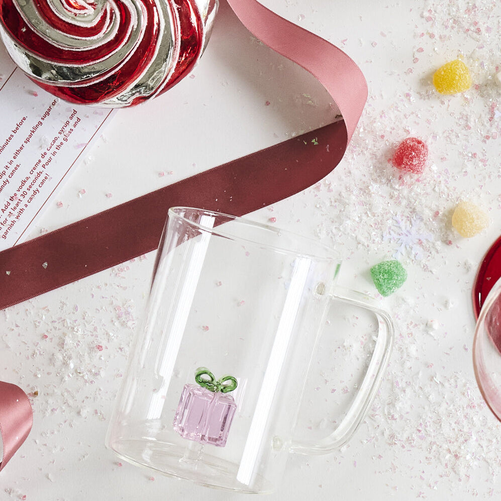 With a surprise at the bottom of this whimsical drinkware, the Trinket Mug will be a favorite for the holiday season. Made of borosilicate glass, this playful, lightweight mug features a miniature pink glass gift box complete with a green bow, attached to the base. This glass is hand wash only, and best for chilled beverages like eggnog or spritzers. Cheers to drinkware that brings on smiles!