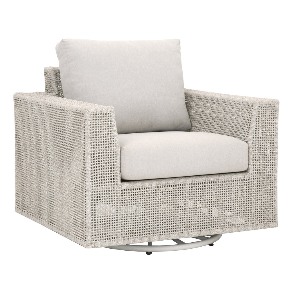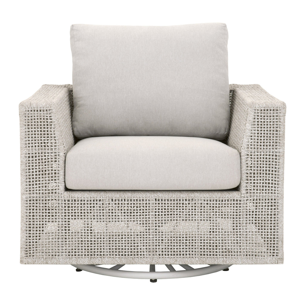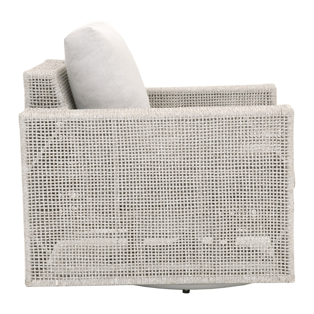 The Essentials for Living Tropez outdoor swivel sofa chair in transitional style featuring an intricate rope weave design and aluminum frame.