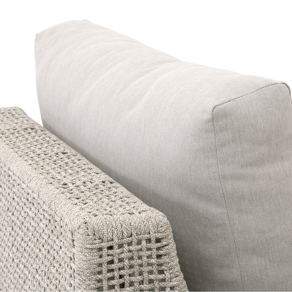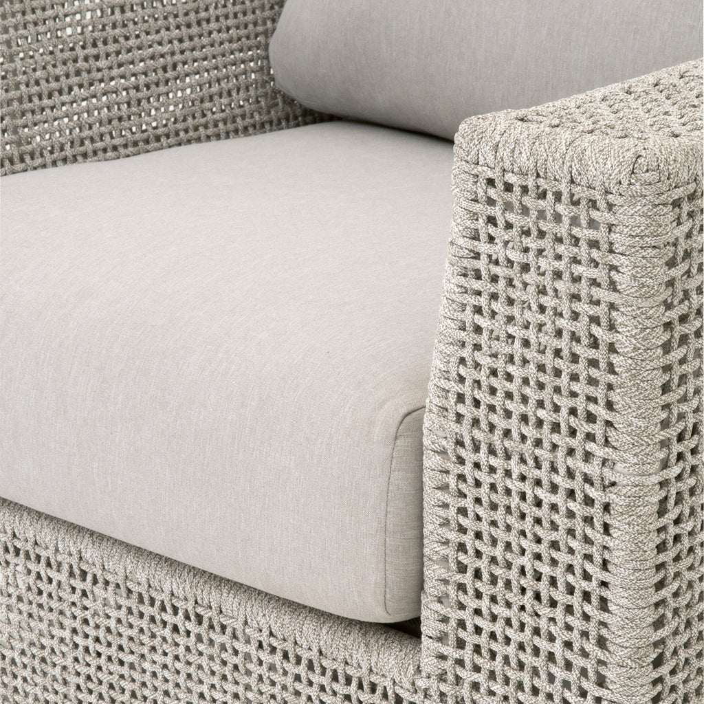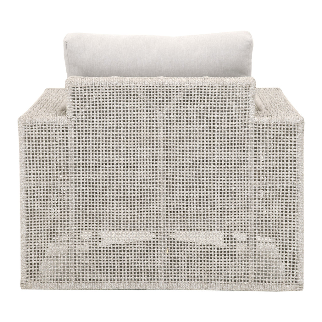 The Essentials for Living Tropez outdoor swivel sofa chair in transitional style featuring an intricate rope weave design and aluminum frame.