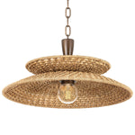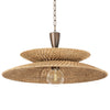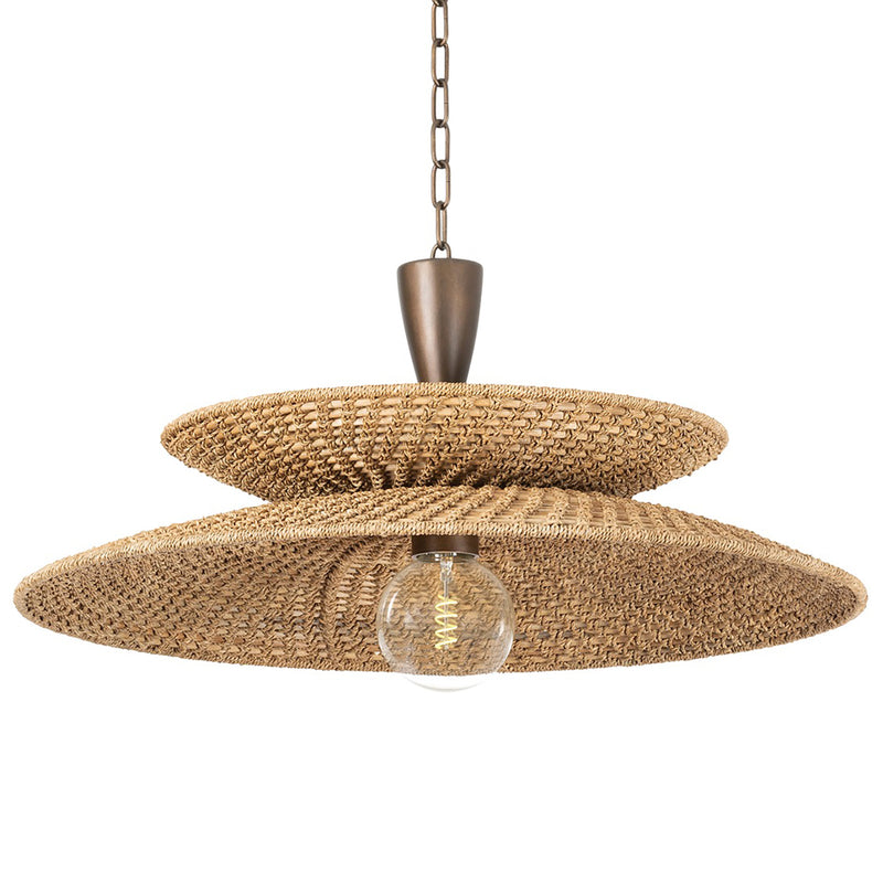 Two shallow shades are stacked in opposite directions to create the balanced artistry of this coastal pendant. The open weave of the natural abaca fiber shades allows light to filter through both sides, producing a dramatic visual effect. For the finishing touch, Troy Landry Pendant dangles from a chunky vintage Gold Leaf chain. Available in two sizes. *Due to the one-of-a-kind nature of the medium, exact colors and patterns may vary slightly from the image shown.