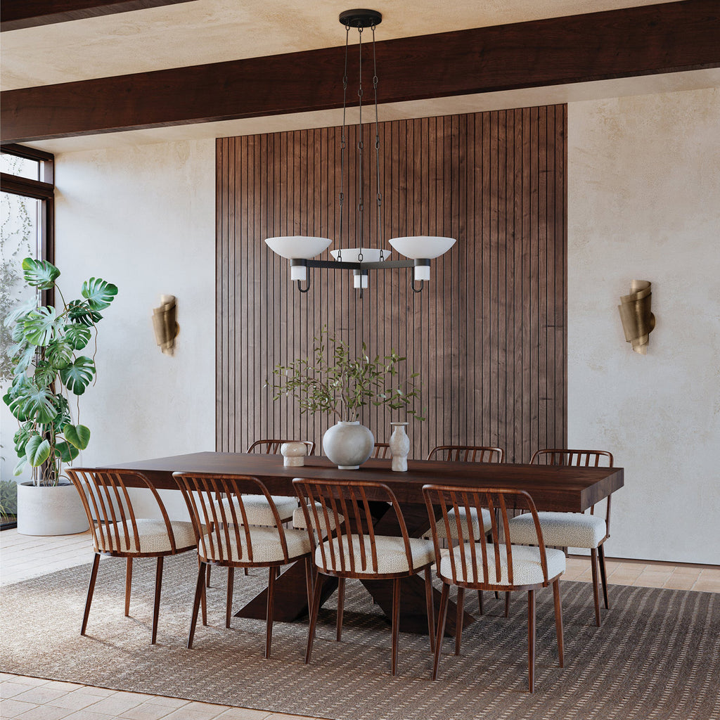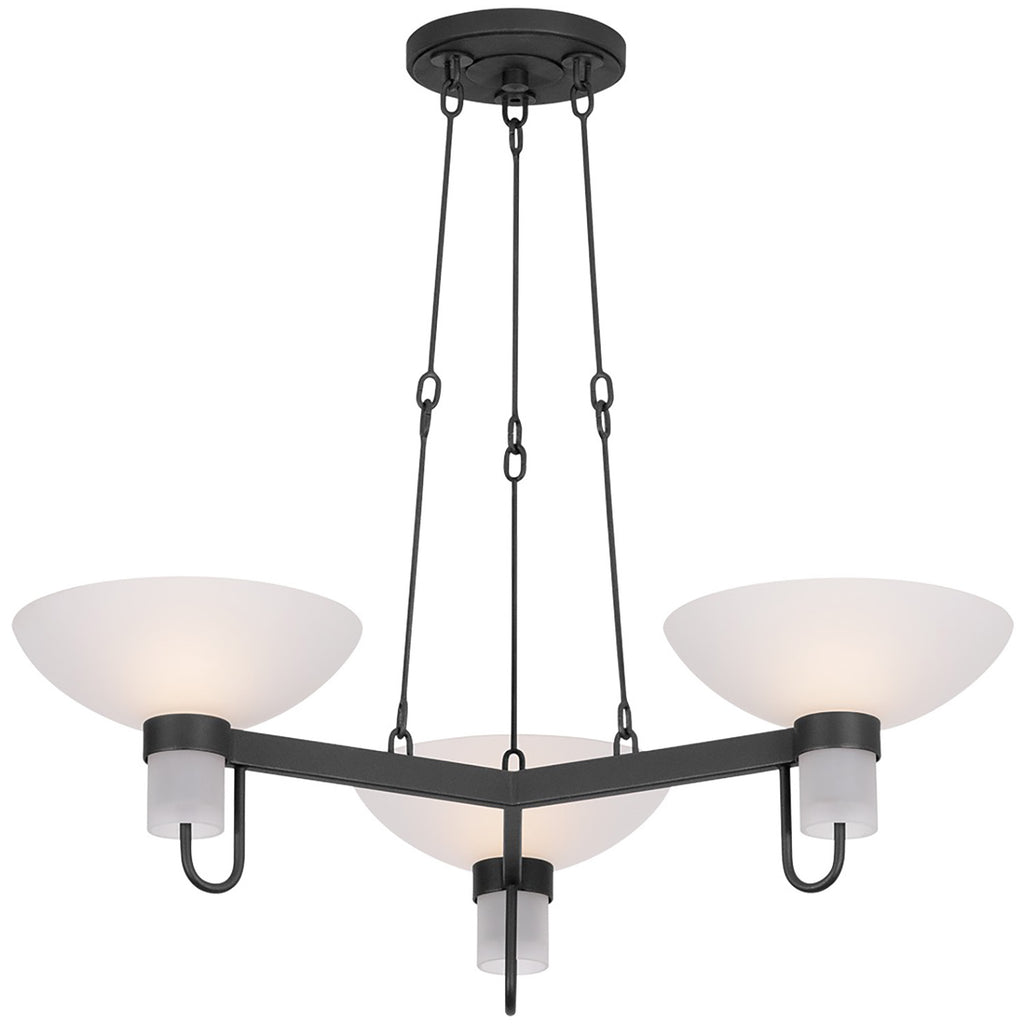 An industrial riff on a 1970s design, Troy Lighting Arturo combines sleek lines, tapered shades, and mechanical hardware details. The etched matte glass of the shades softens the Textured Bronze (TBZH) finish of the frame while gently diffusing light throughout a room. Available as a sconce or a 3-light chandelier, Arturo proves that practicality doesn’t limit character.