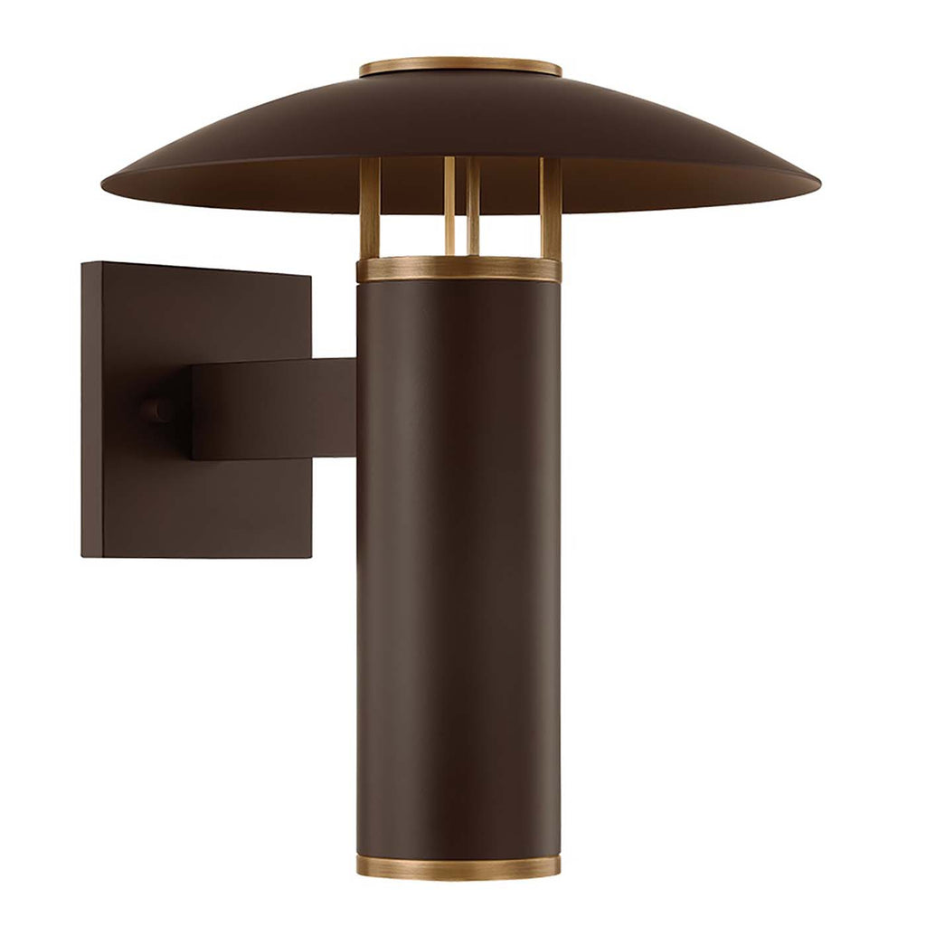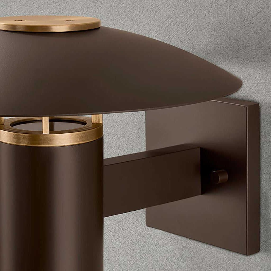 Combining the classic with the cool, the Troy Lighting Birk family blends sleek architectural lines with an understated RLM shade to create a convenient exterior lighting solution. Featuring two wall-mounted sconces and a portable, battery-powered table lamp, the designs reflect LED light downward after it bounces off the shallow dome shade. The integrated handle of the table lamp encourages portability, making it perfect to carry both indoors and outdoors. Birk is finished in Bronze with Patina Brass accents.
