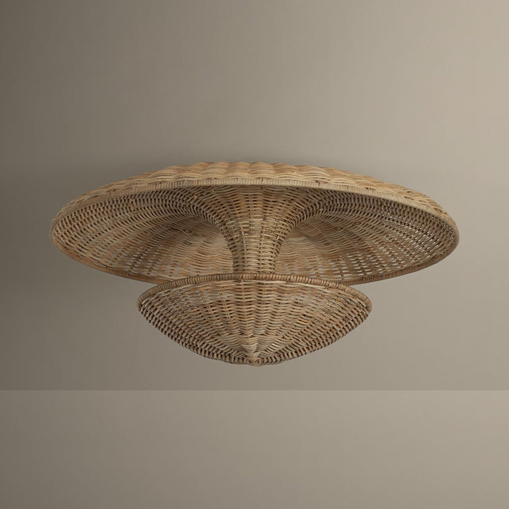 A force of nature, Troy Lighting Draco blends mid-century style with artisanal craftsmanship. Supported by a Bronze Leaf stem, the silhouette is based on a classic 1960s reflector form with a handwoven twist. The natural openness of the light natural wicker weave allows light to filter through all sides of the fixture. Available as a 3-light semi-flush or 3-light pendant in two sizes, Draco makes for an impressive focal point.