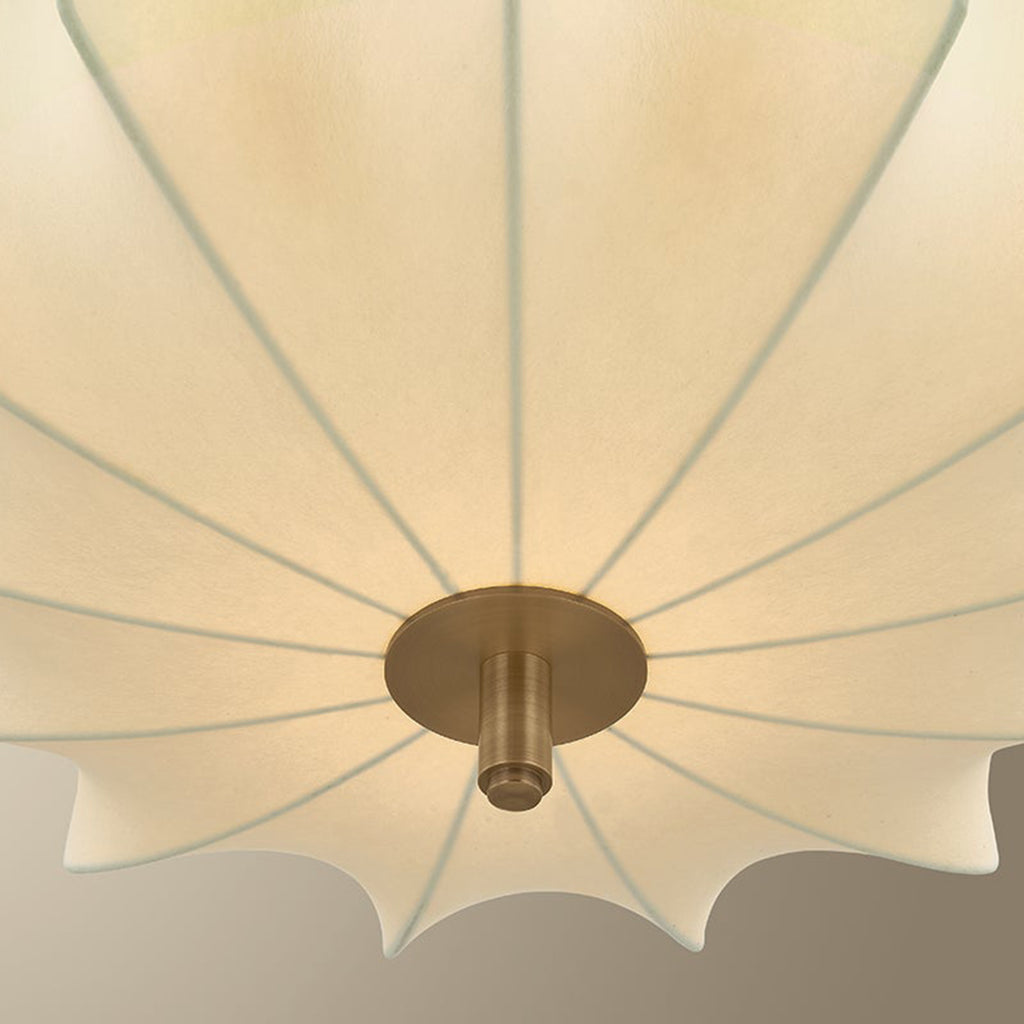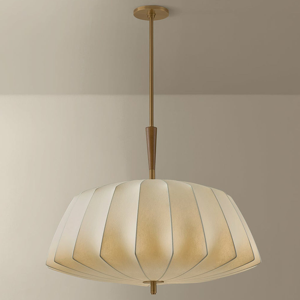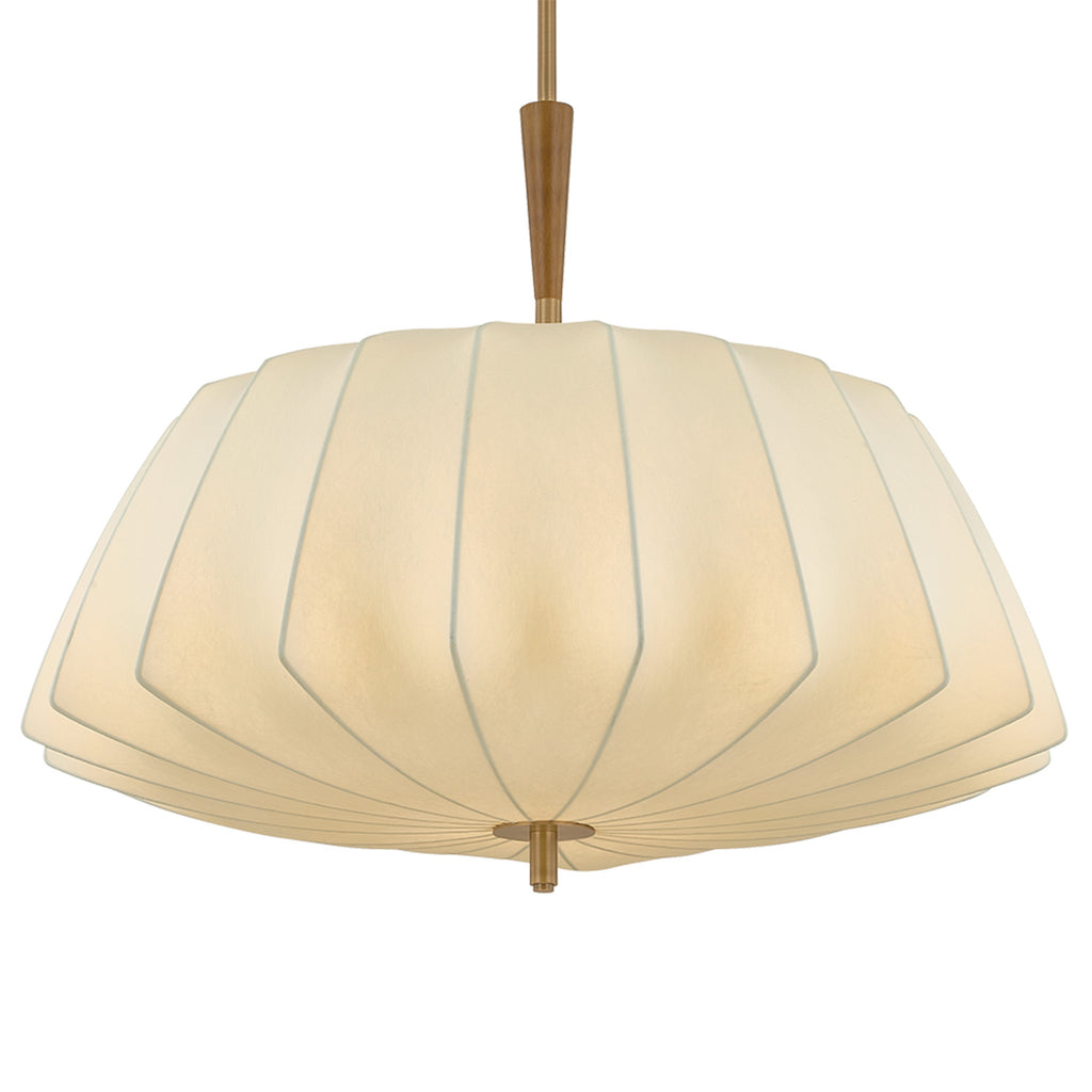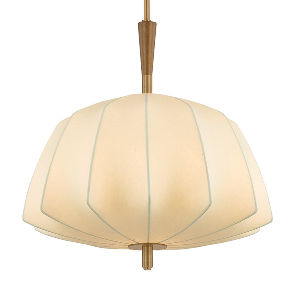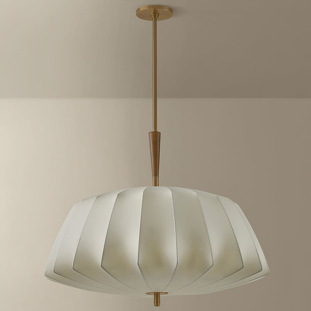 The Troy Lighting Flinders pendant takes inspiration from mid-century lanterns, reimagined with sculptural softness. A large faceted shade made from cream polymer fabric diffuses light in quiet, dimensional folds. The Patina Brass suspension creates the effect of piercing the shade, accented by a turned oak wood detail on the top. Available in two sizes, Flinders adds an air of drama wherever it is placed.