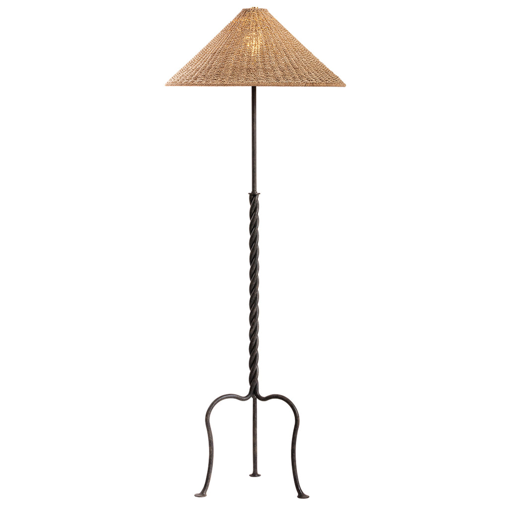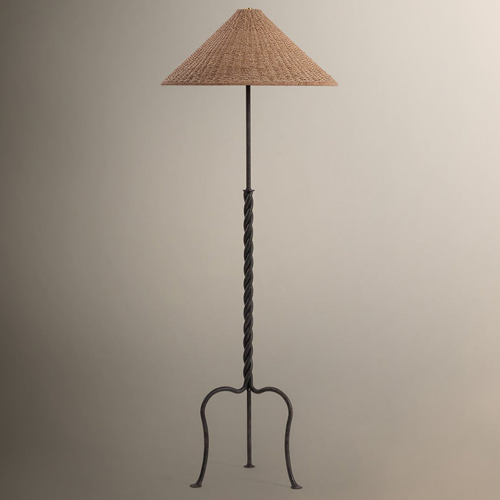 The Troy Lighting Francisco floor lamp celebrates the creative capabilities of metalwork. The French Iron frame features a twisted stem and artful tripod base, highlighting the craftsmanship behind this charming lamp. A woven natural abaca shade tops the design, diffusing light through natural fibers as a warm note of contrast.