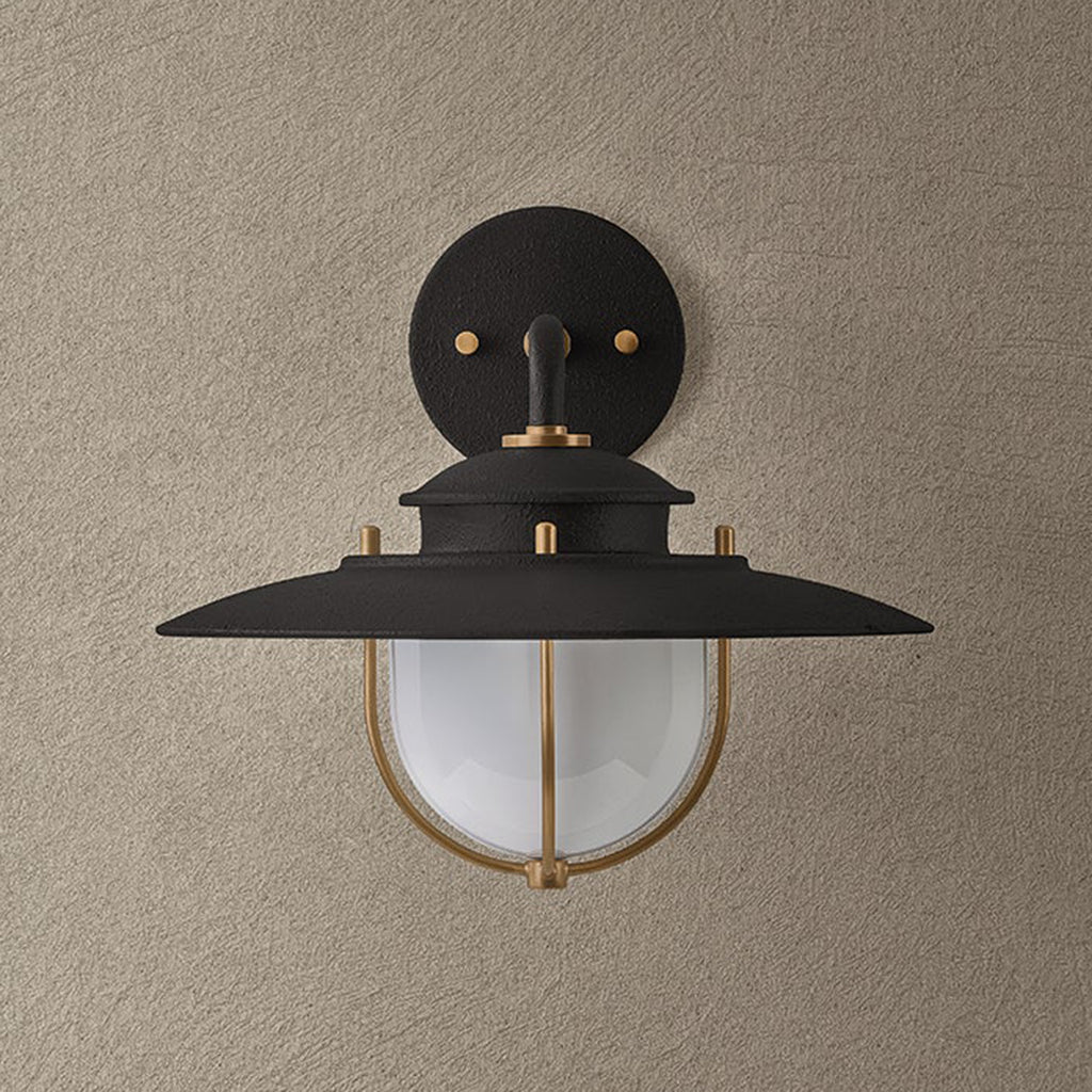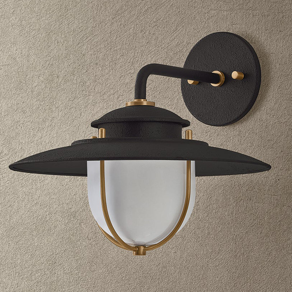 The Troy Lighting Greentree sconce updates a classic RLM silhouette with mixed finishes and softened forms. Finished in Forged Iron, the frame has an old-world appeal, accented by a Patina Brass cage and finials that wrap around an opal glossy glass diffuser. Subtly curved lines bring a fresh perspective to the traditional silhouette. Available in two sizes, Greentree suits a range of outdoor settings.