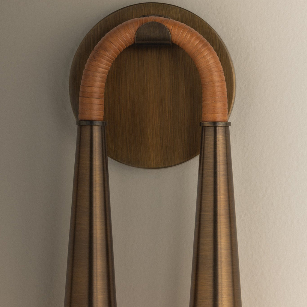 Reminiscent of a hanging tassel, Troy Lighting Hawke is jewelry for the wall. Two cones finished in Patina Brass drape from a curved, softly hooked backplate. A rattan-skin wrapped detail along the U-shaped arm introduces a tactile accent, while clear inside-etched glass shades diffuse the light at each end. Thoughtfully balanced and richly detailed, Hawke is a statement in both materiality and design.