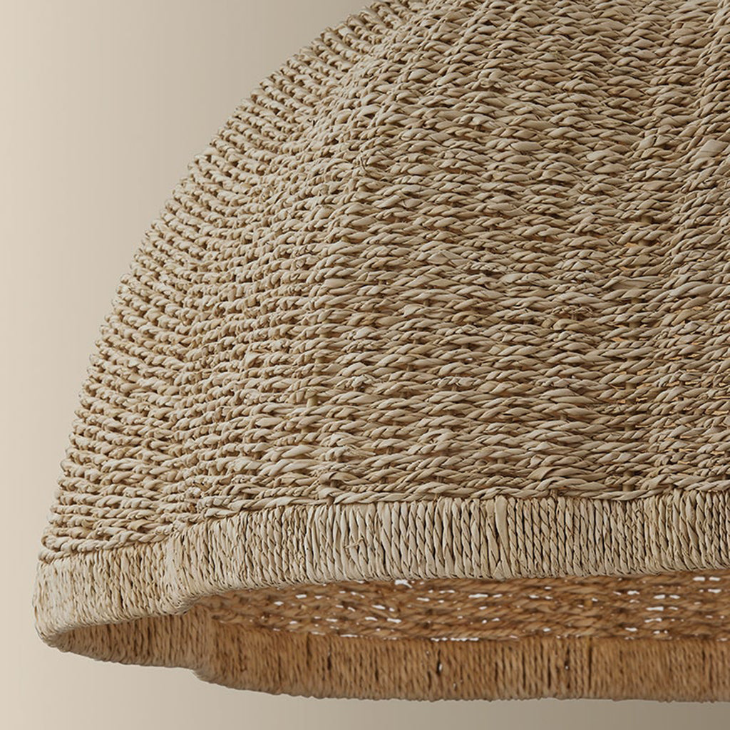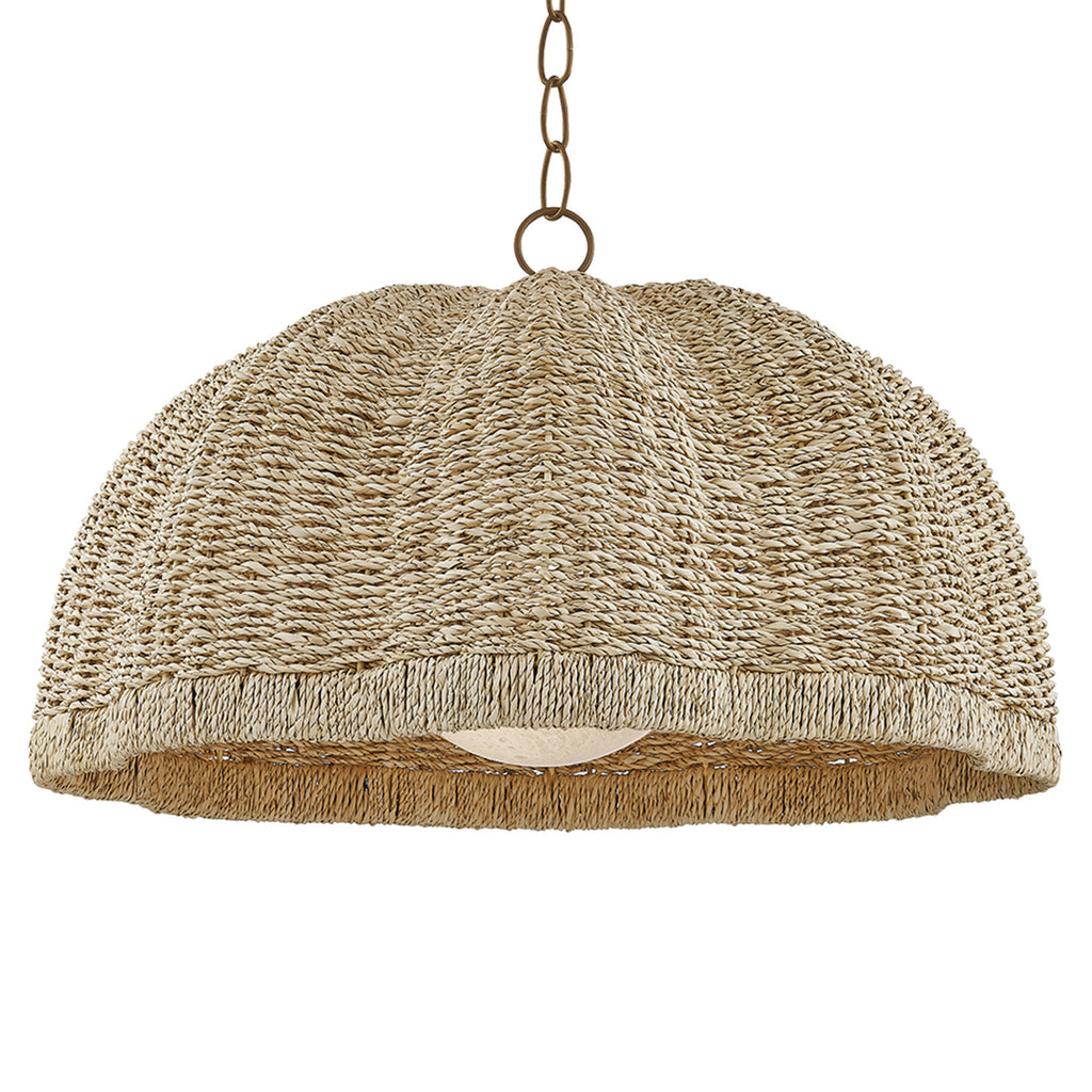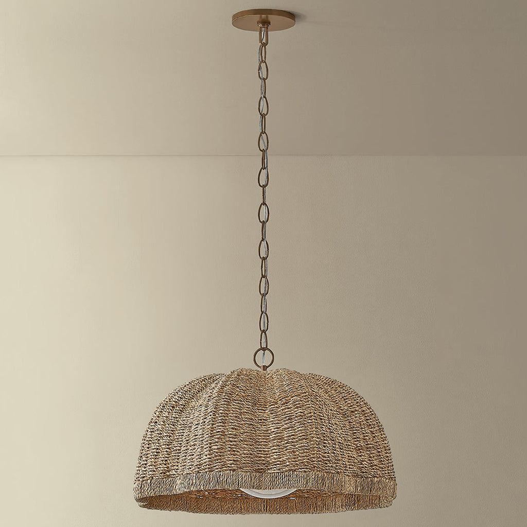 The lofty, vaguely botanical form of the Troy Lighting Jack pendant plays with light through its textural shade. Woven from natural Banana Leaf Cord, the broadly scalloped shade features a distinctive vertical wrap at the edge. A clear cloud seedy glass globe rests within like a pearl. Suspended from a Patina Brass chain and available in two sizes, this pendant brings a chic, bohemian energy to a kitchen, dining, or living space.