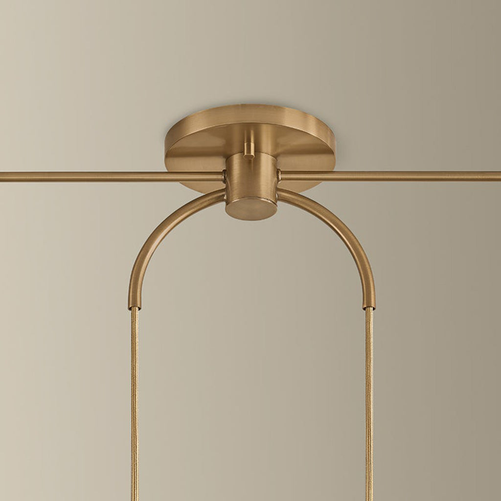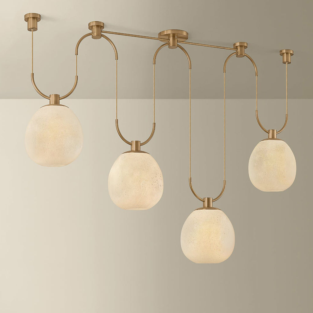 Soft and sculptural, the Troy Lighting Jove family filters light through an organic, jewelry-like lens. Each cloud seedy glass shade hangs from a looping Patina Brass frame, recalling the drape of a necklace. The cords can be adjusted to varying lengths, allowing for a customized composition. Available as a 1-light sconce, 1-light pendant, or 3-chandelier and 4-light linear, Jove is both a highly usable fixture and a statement-making ornament.
