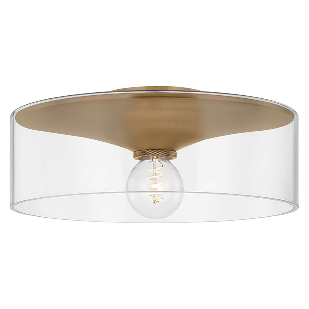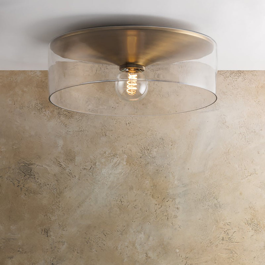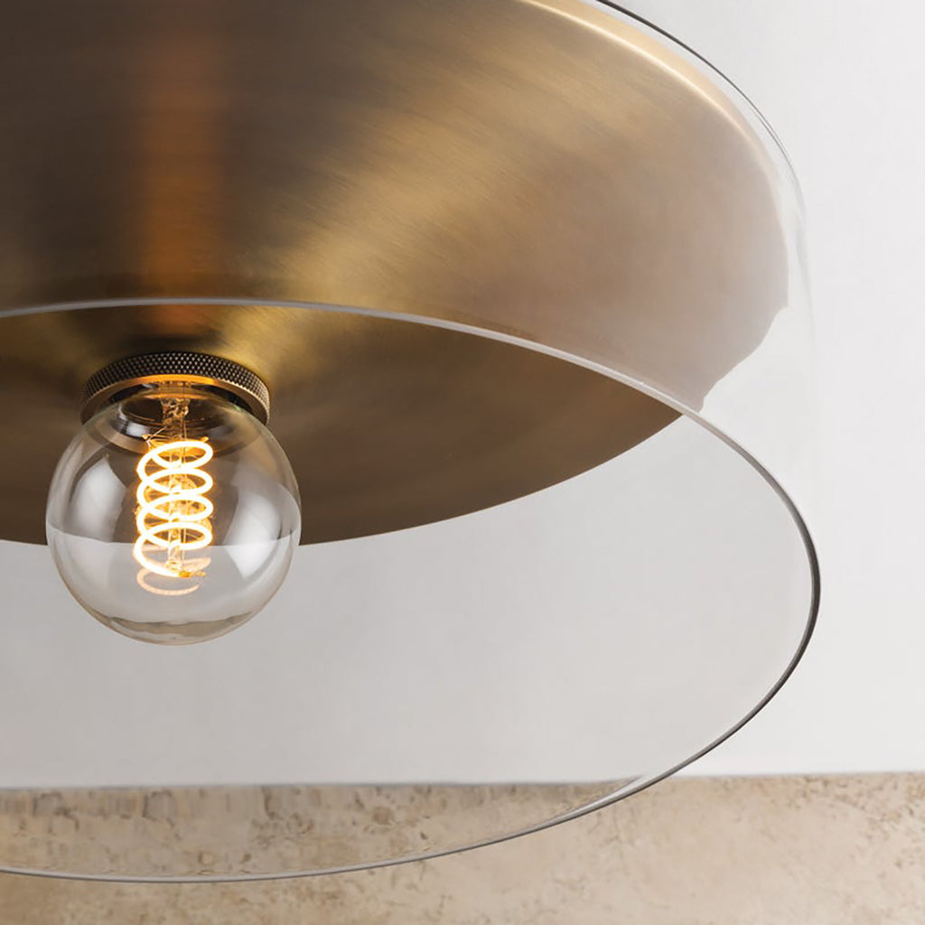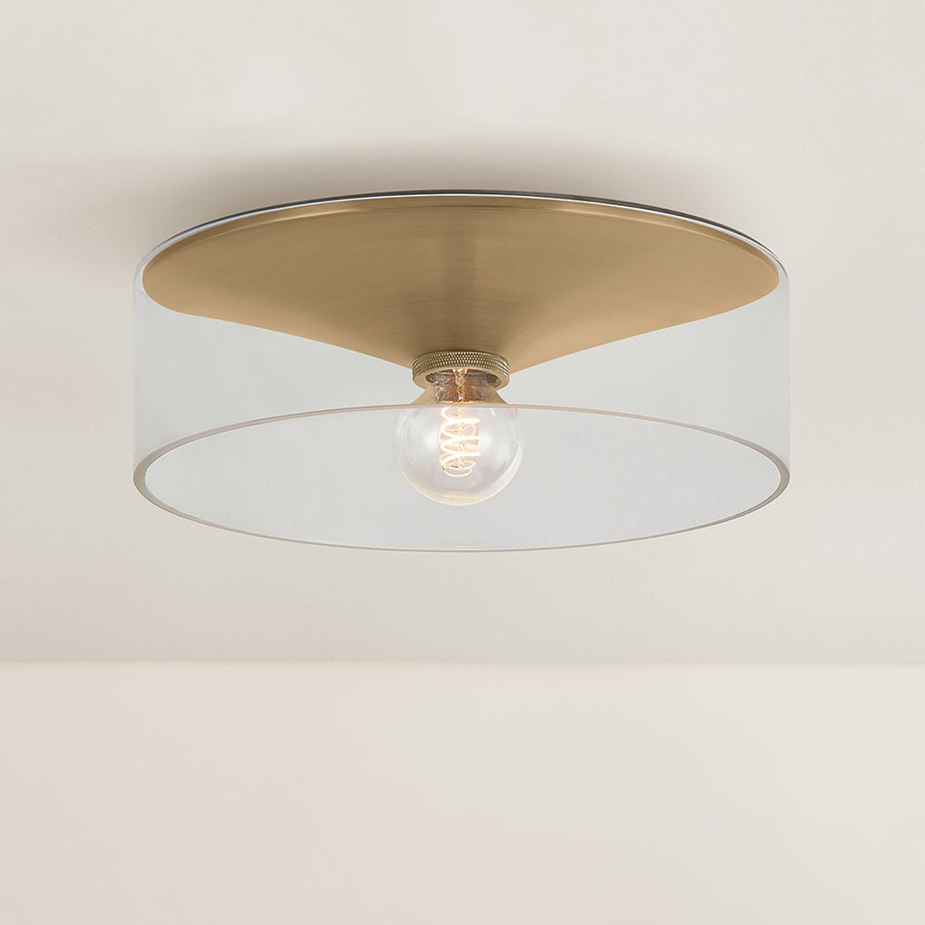 The Troy Lighting Killian flush mount’s imaginative design is simple yet impactful. An inner funnel-shaped metal dish is encased by a cylindrical outer glass piece, creating a seamless shade. As a notable detail, a clear glass bulb emerges from the central gap like a drop of water. The Patina Brass finish adds a soft warmth to this organically-inspired fixture.