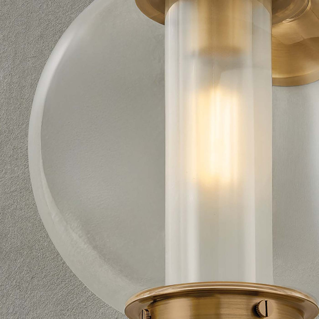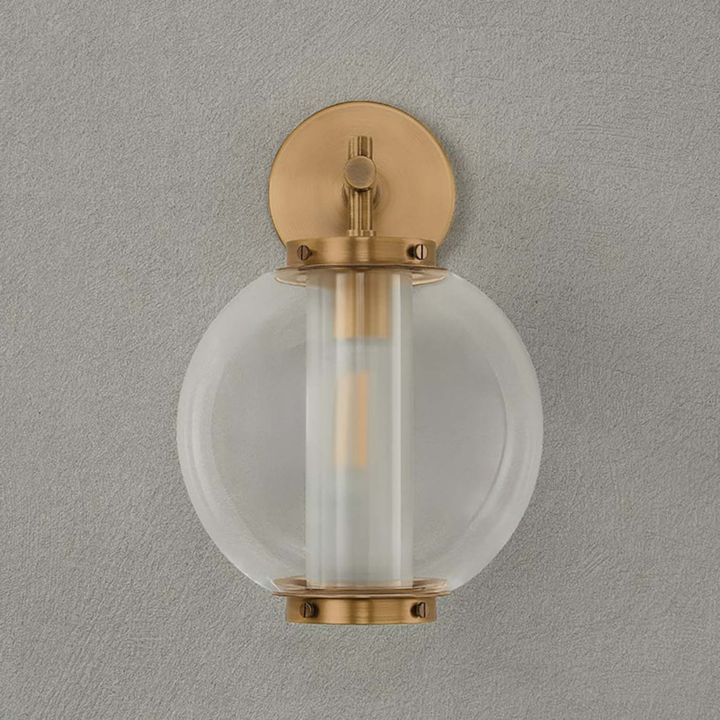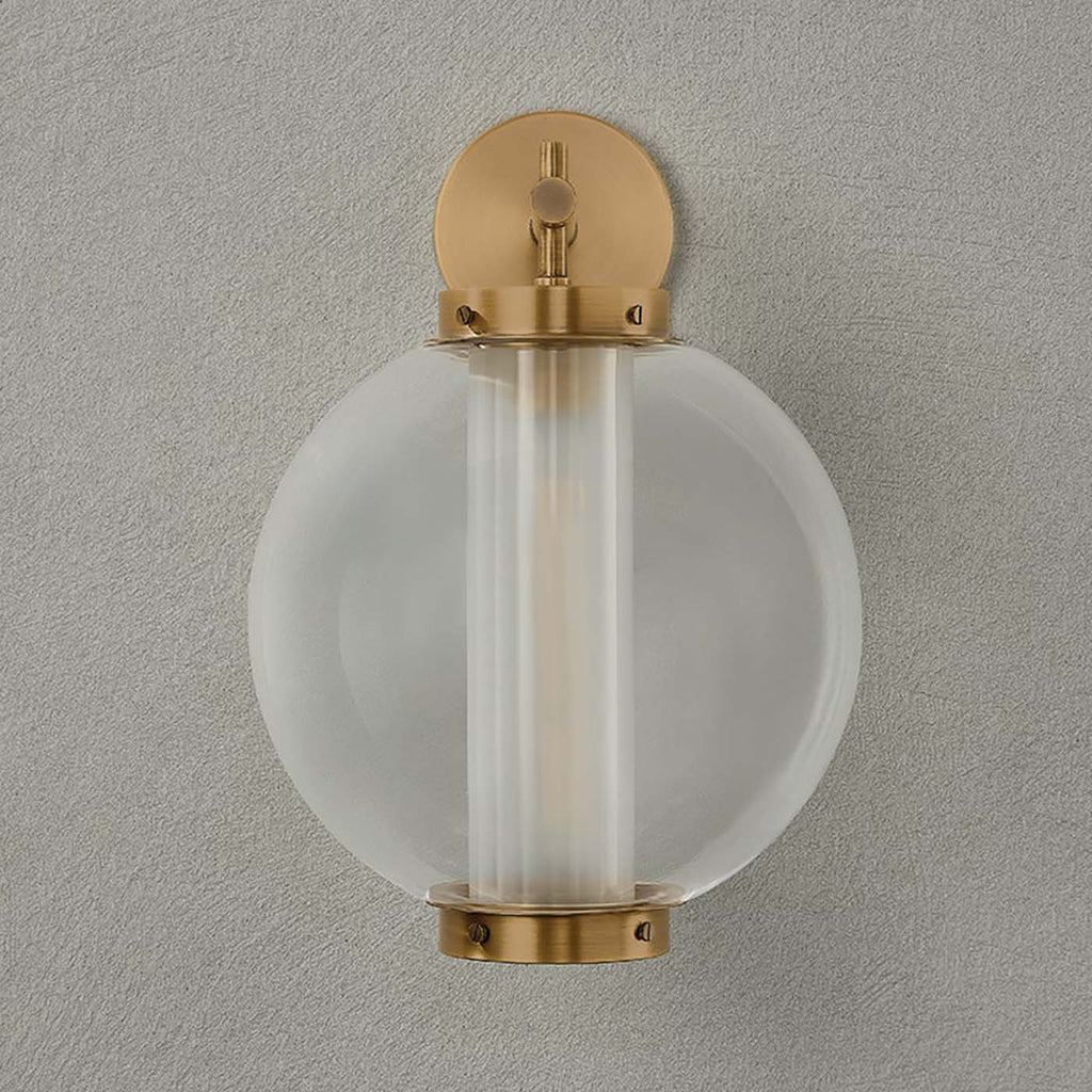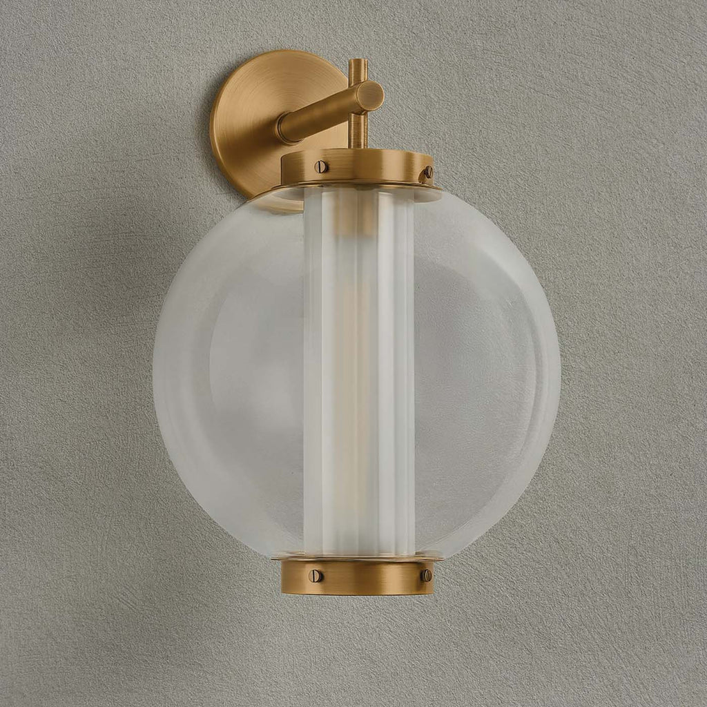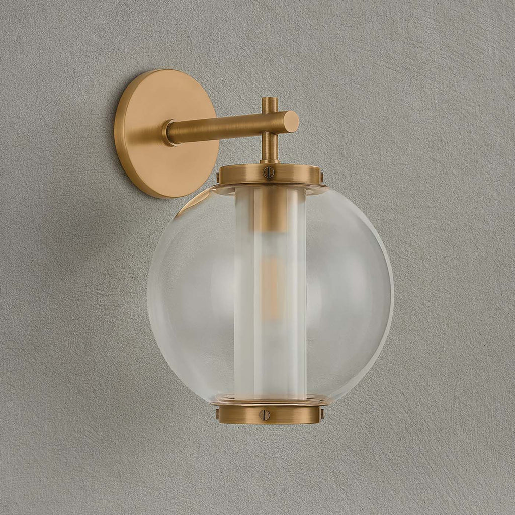 An elevated globe sconce, Troy Lighting Marco combines curved glass and angular metalwork to create a modern, distinctive look for the outdoors. The lantern-style hanging design features a large, clear glass orb suspended from minimalist industrial fittings. Within the shade, a ribbed glass tube conceals the light source while adding a dynamic geometric layered effect. Marco is available in two sizes with Patina Brass or Bronze finish options.