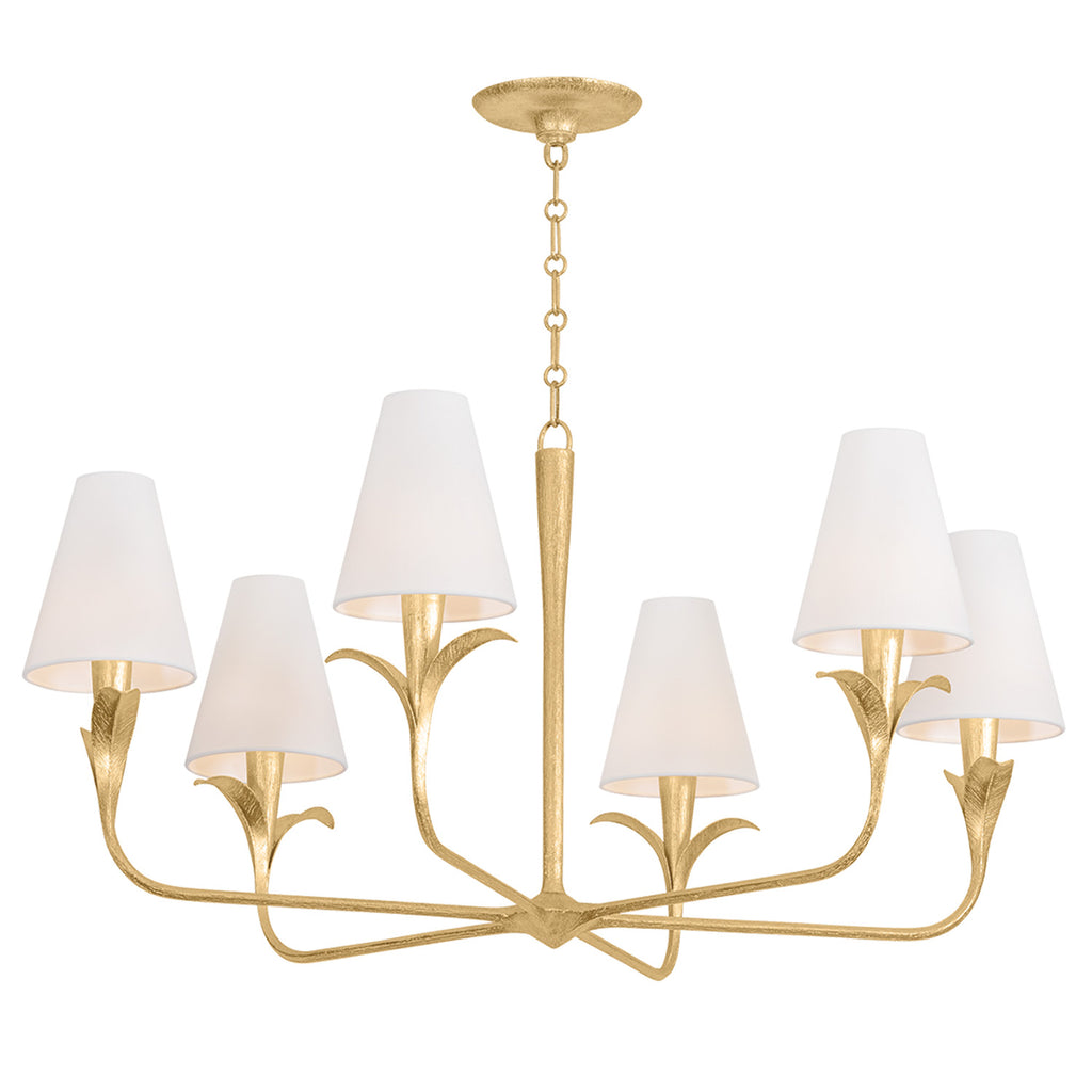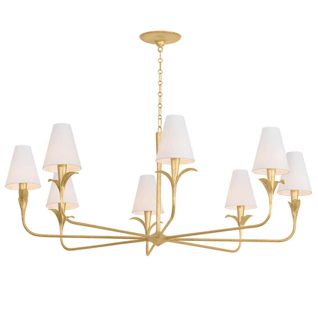 Equally captivating with or without the white linen shades, Troy Lighting Quill blooms with botanical inspiration. Using dynamic shaping, it creates eye-catching statement pieces with curved armatures and leaf-like bobeche details. A Gilded Ivory finish lends a delicacy to the design. Available as a 1-light sconce and 6- and 8-light chandelier.