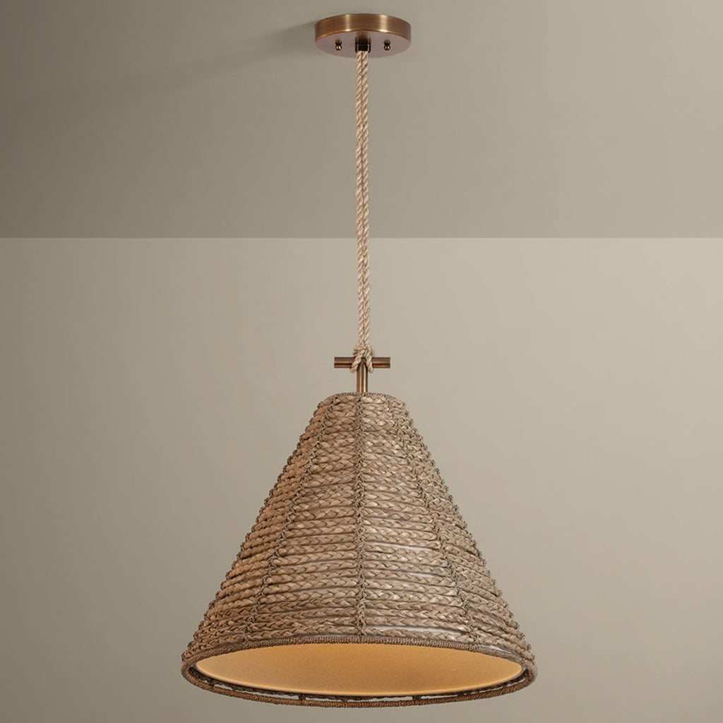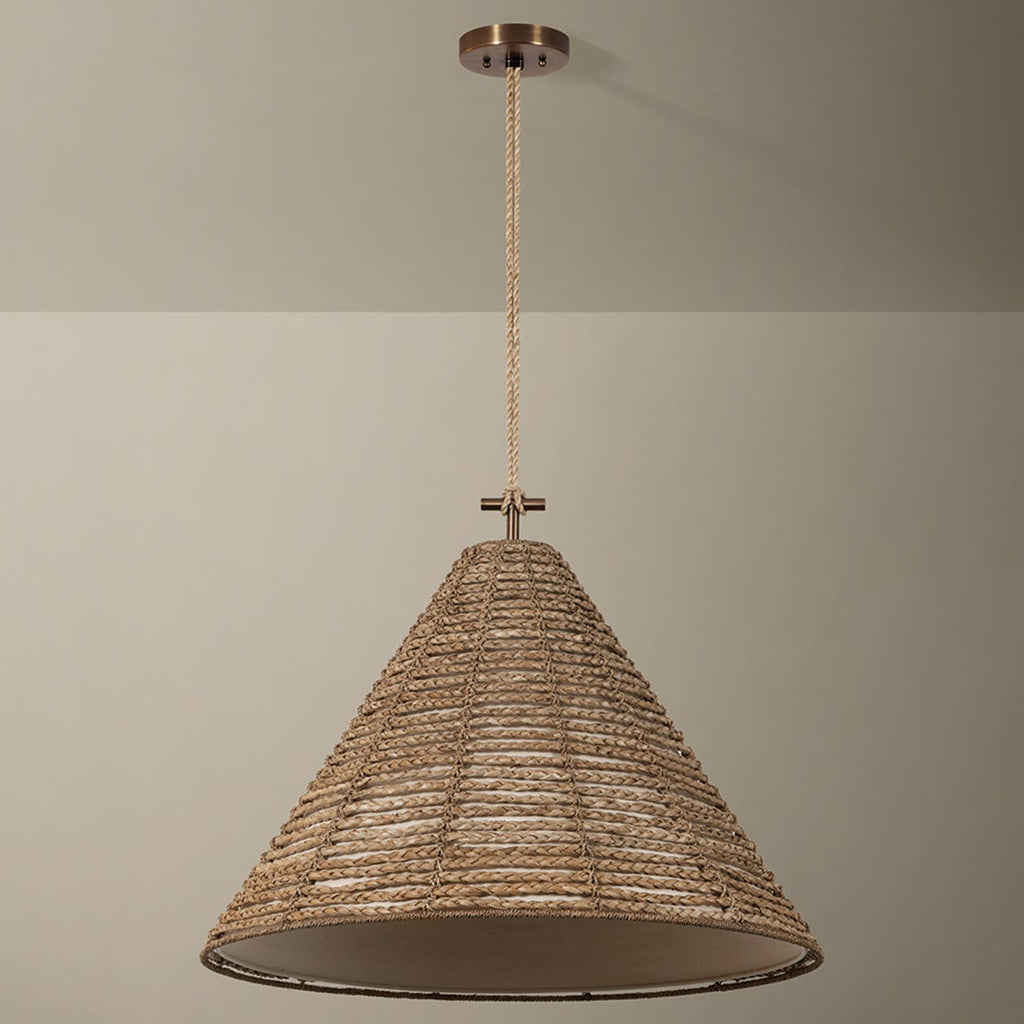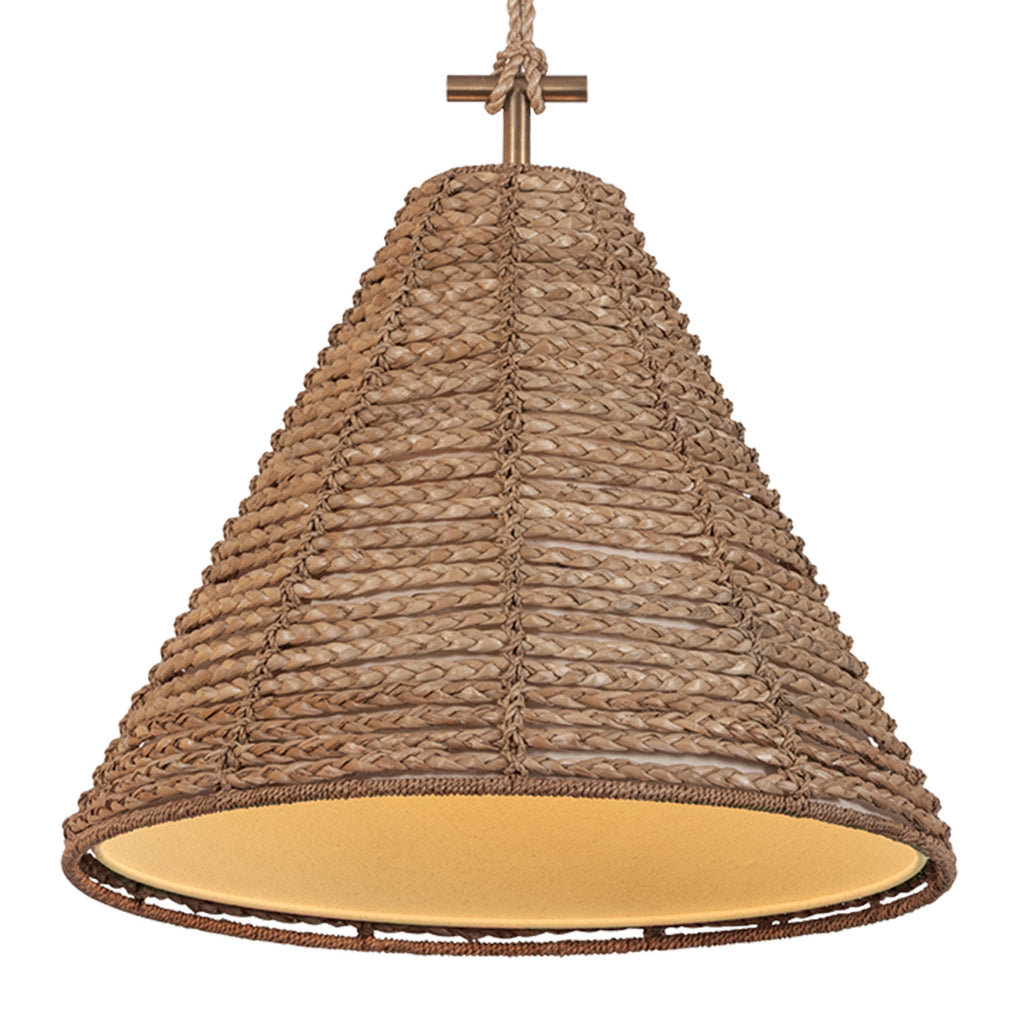 The Troy Lighting Redwood family brings coastal ease to contemporary forms. A wheat linen shade is wrapped in abaca rope, diffusing light in warm, dimensional tones. In keeping with the nautical theme, the rope suspension terminates in a knot. The material’s elegant earthiness pairs with rich Patina Brass fittings. Available as a 1-light sconce and 1-light pendant in two sizes.