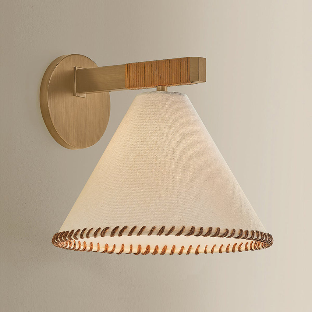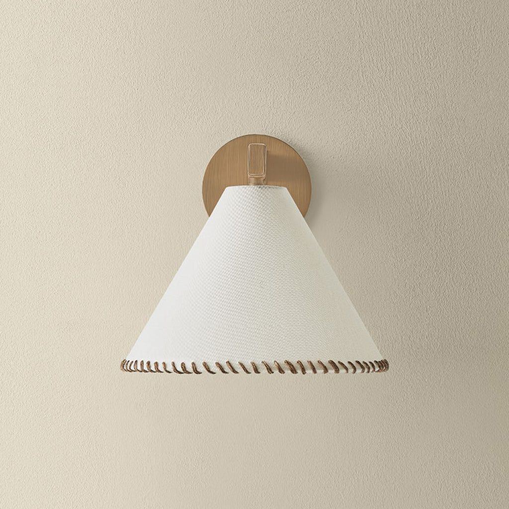 The architectural design language of the Troy Lighting Stoney family is softened by its unique material qualities. Large conical white linen shades are edged with contrasting whip-stitching, echoing the natural jute wrap details along the Patina Brass frames. Available as a 1-light sconce, 1-light pendant, 5-light chandelier, and 1-light floor lamp, Stoney is an ode to craftsmanship.