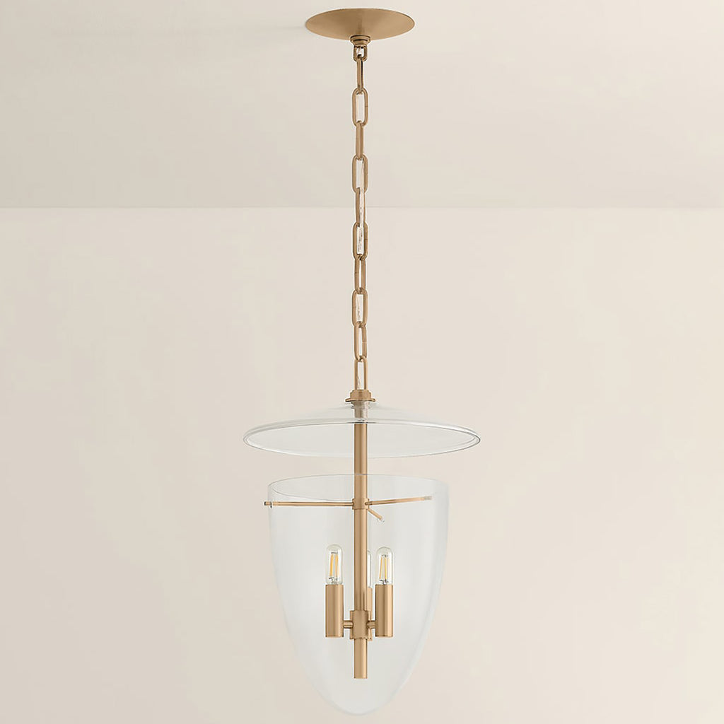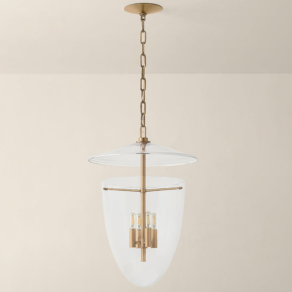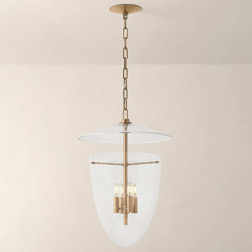 This artful transitional lantern features an inverted bell jar shape with a suspended glass disc at the top. The all-glass composition is fresh and unexpected, revealing clean metalwork inside. Available with 3 or 4 lights, Tully comes in Patina Brass for a classic finish or Vintage Pewter for a sleeker appearance.