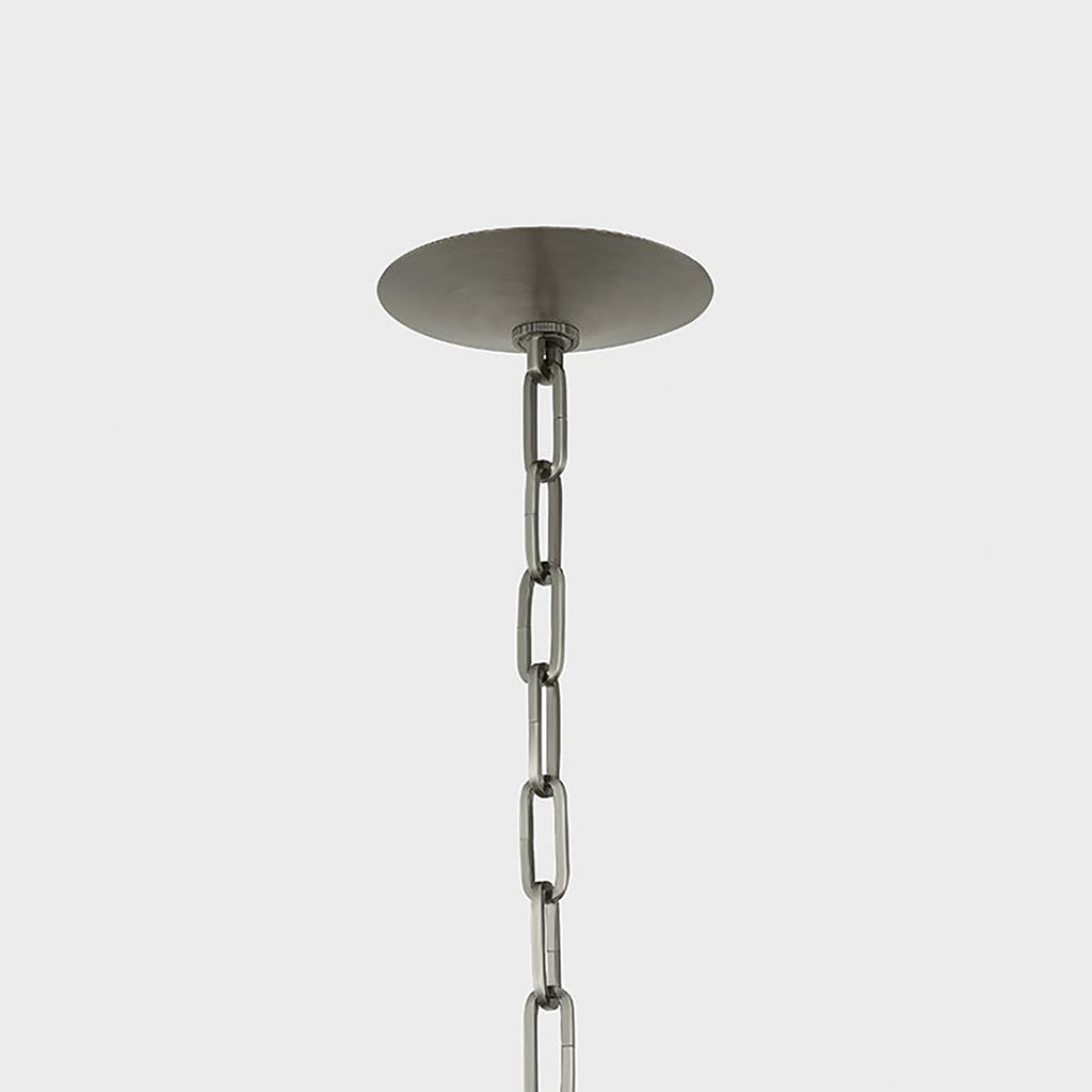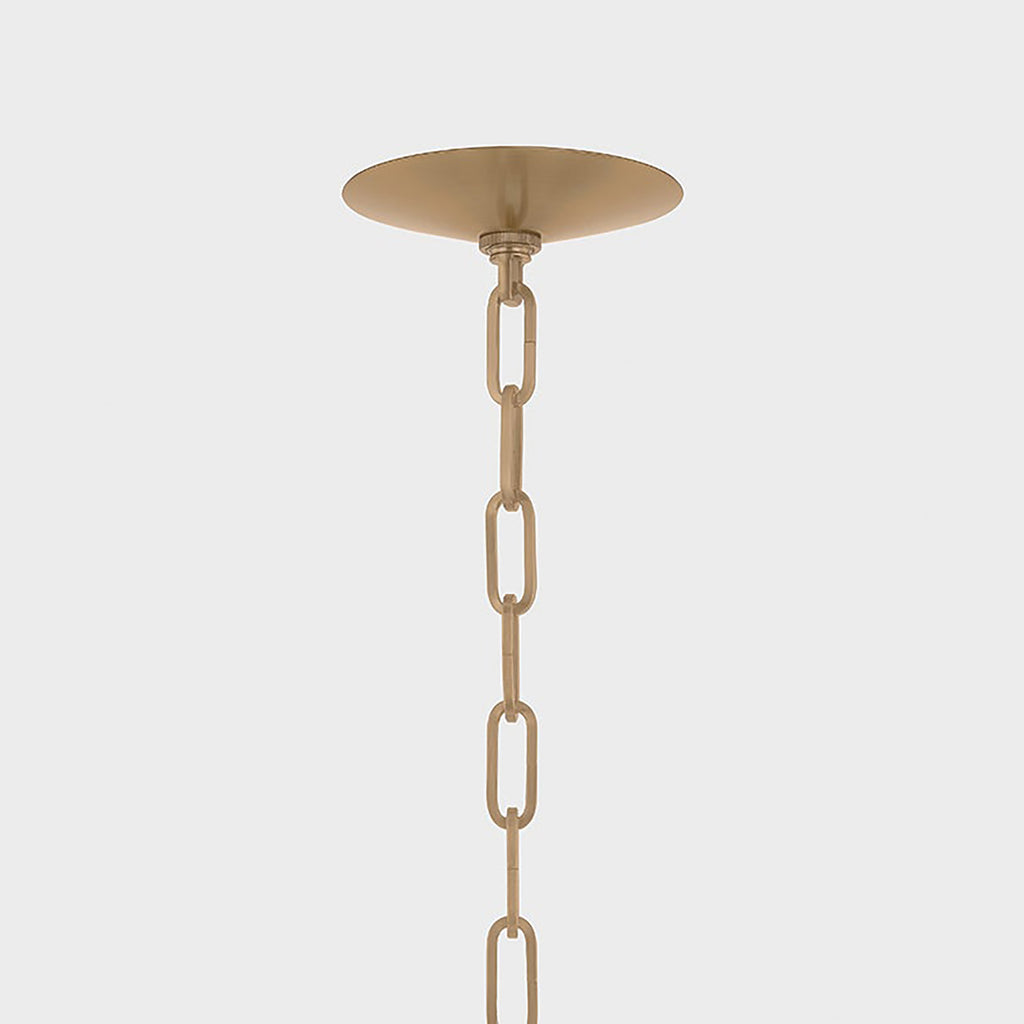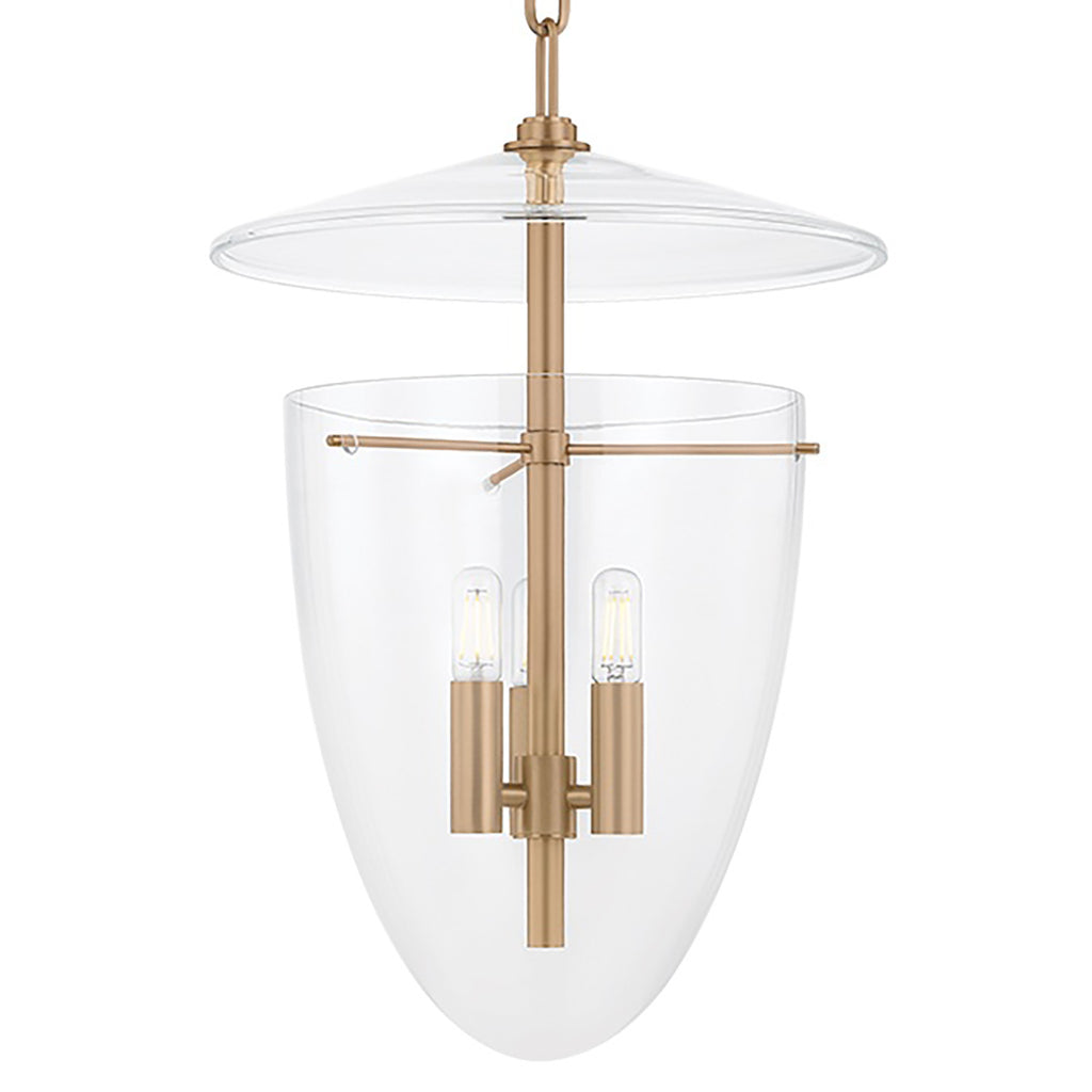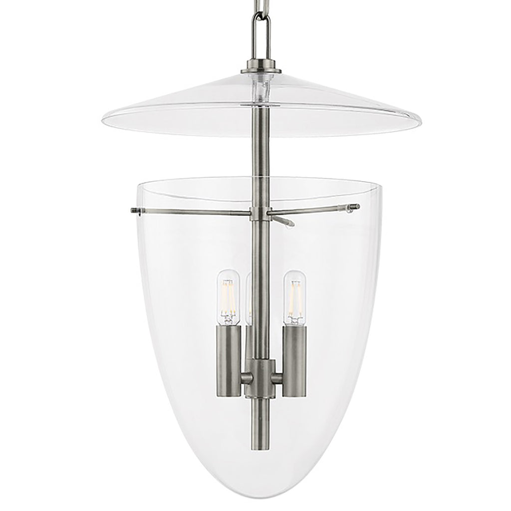 This artful transitional lantern features an inverted bell jar shape with a suspended glass disc at the top. The all-glass composition is fresh and unexpected, revealing clean metalwork inside. Available with 3 or 4 lights, Tully comes in Patina Brass for a classic finish or Vintage Pewter for a sleeker appearance.