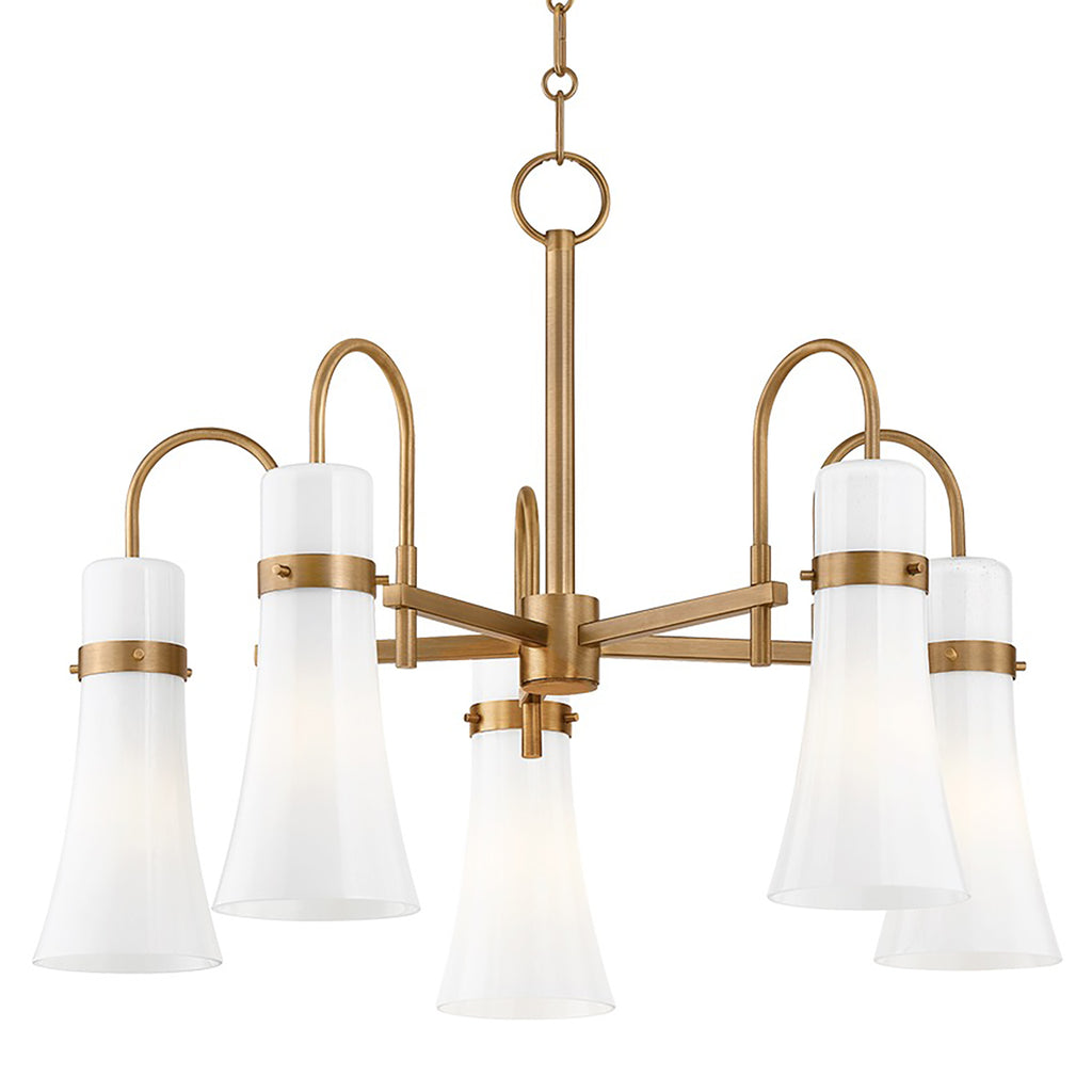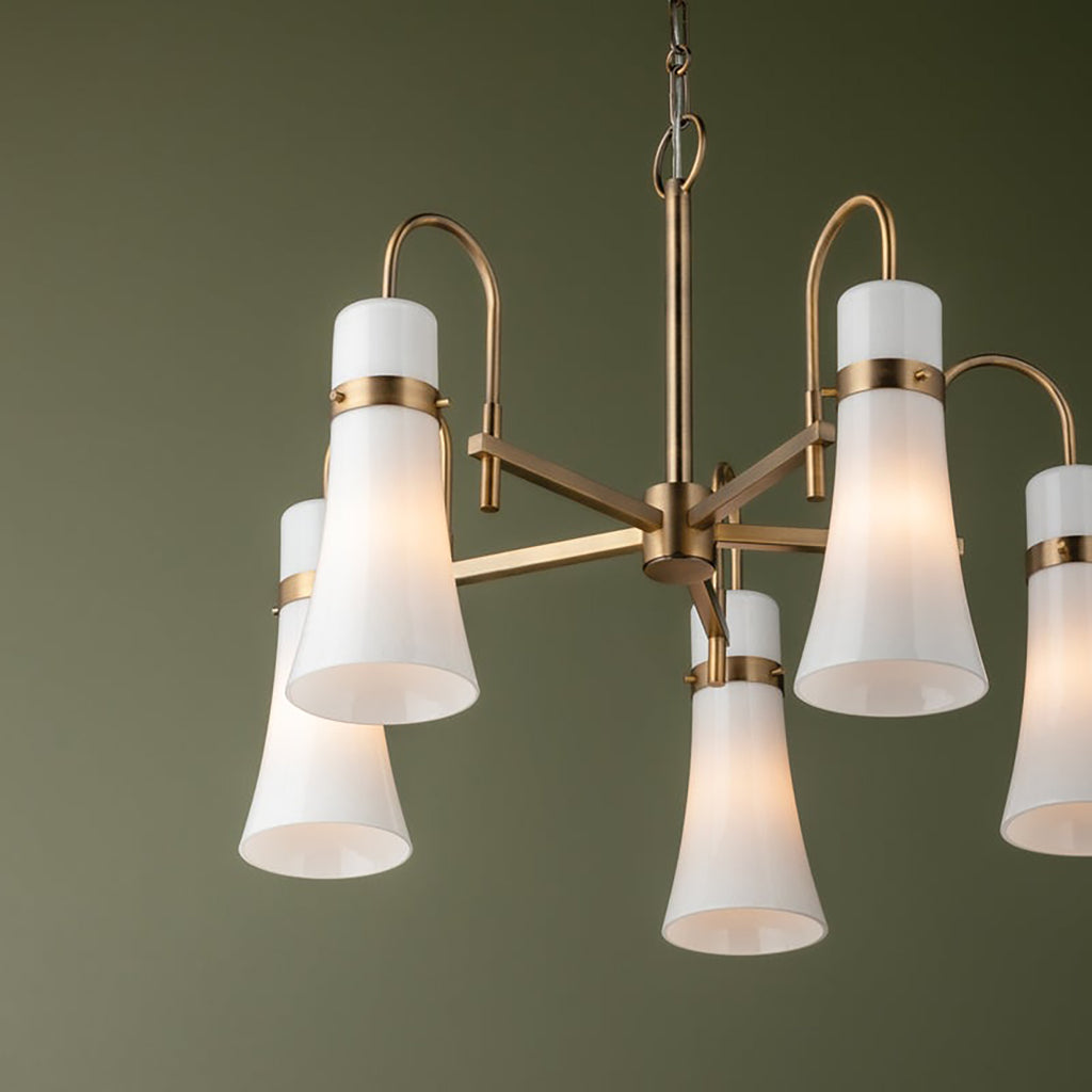 Troy Maple Chandelier exudes elegance with its cool curves and vintage-inspired shades. The shape of the seeded opal glass shades feels organically inspired, while small knob details on the Patina Brass metalwork strike an industrial note. Whether you choose a 1-light sconce or a 5 or 6-light chandelier, there are plenty of ways to make a statement with Troy Maple.