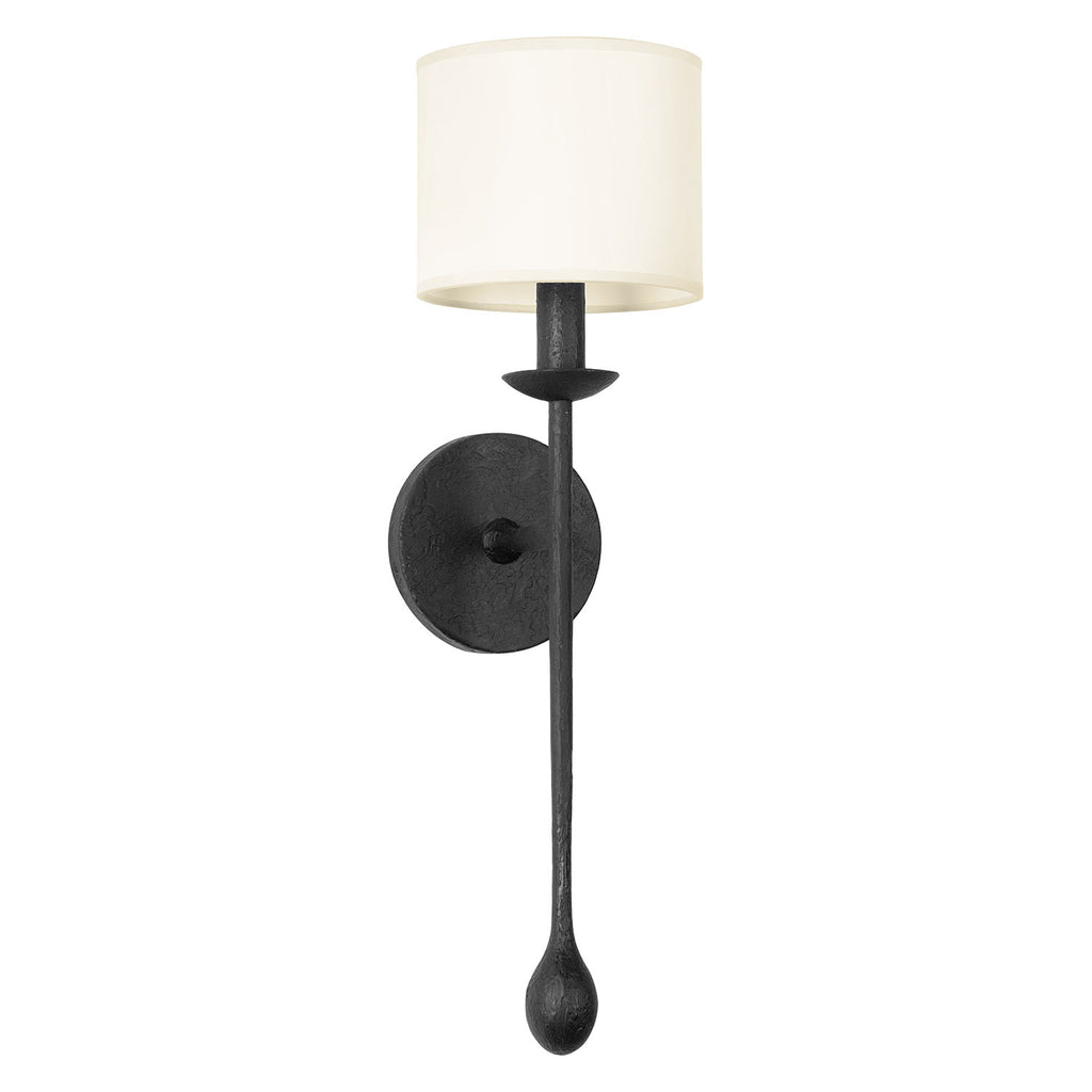 Casual, sophisticated, and little bit curious, express yourself with eclectic, artisan-made lighting by Troy. The traditional slender arm, candlestick, drum shade combination is updated by heavily textured, gorgeous metalwork and a beautiful teardrop dangle accent that elongates the silhouette on the Osmond wall sconce. The Vintage Gold Leaf finish enhances the design's feminine feel and the Black Iron brings an edgier look.
