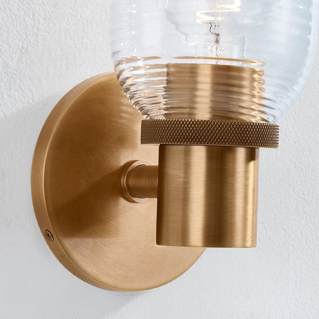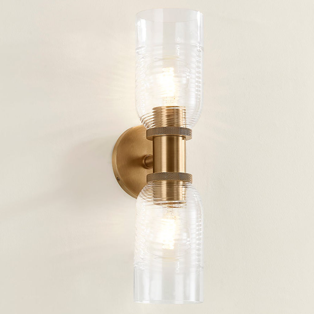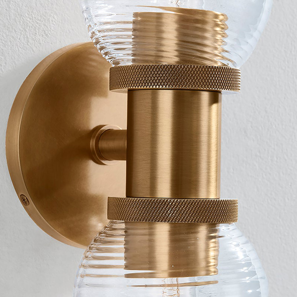 Striking the balance between hard and soft geometries, the Troy Redding wall sconce features straight-edged, knurled metal work supporting one or two glass shades. The glass shades feature ribs, which transition from closely to loosely spaced and eventually fade away, mimicking ripples created by a droplet of water. Enhanced with a warm Patina Brass finish, Redding evokes an old-world feel mixed with modern simplicity.