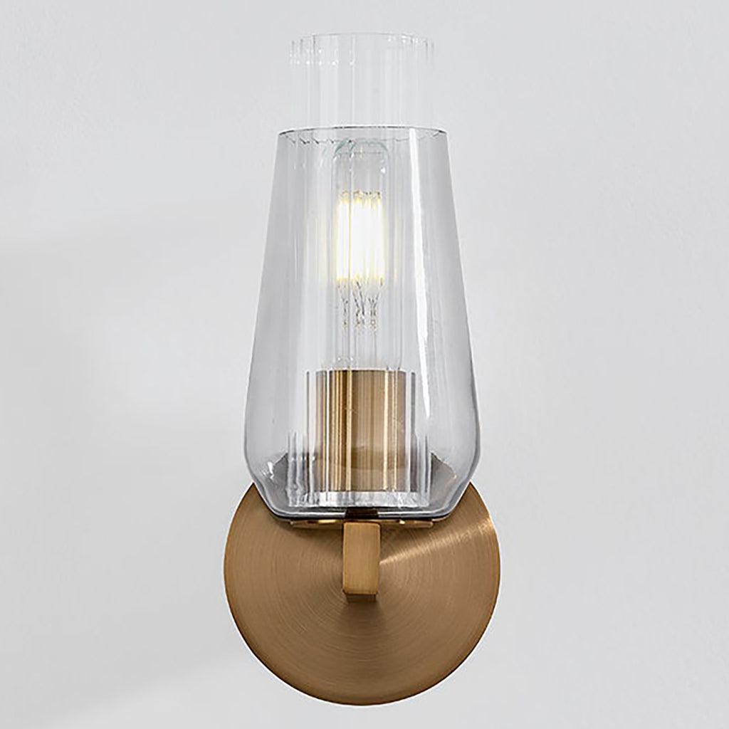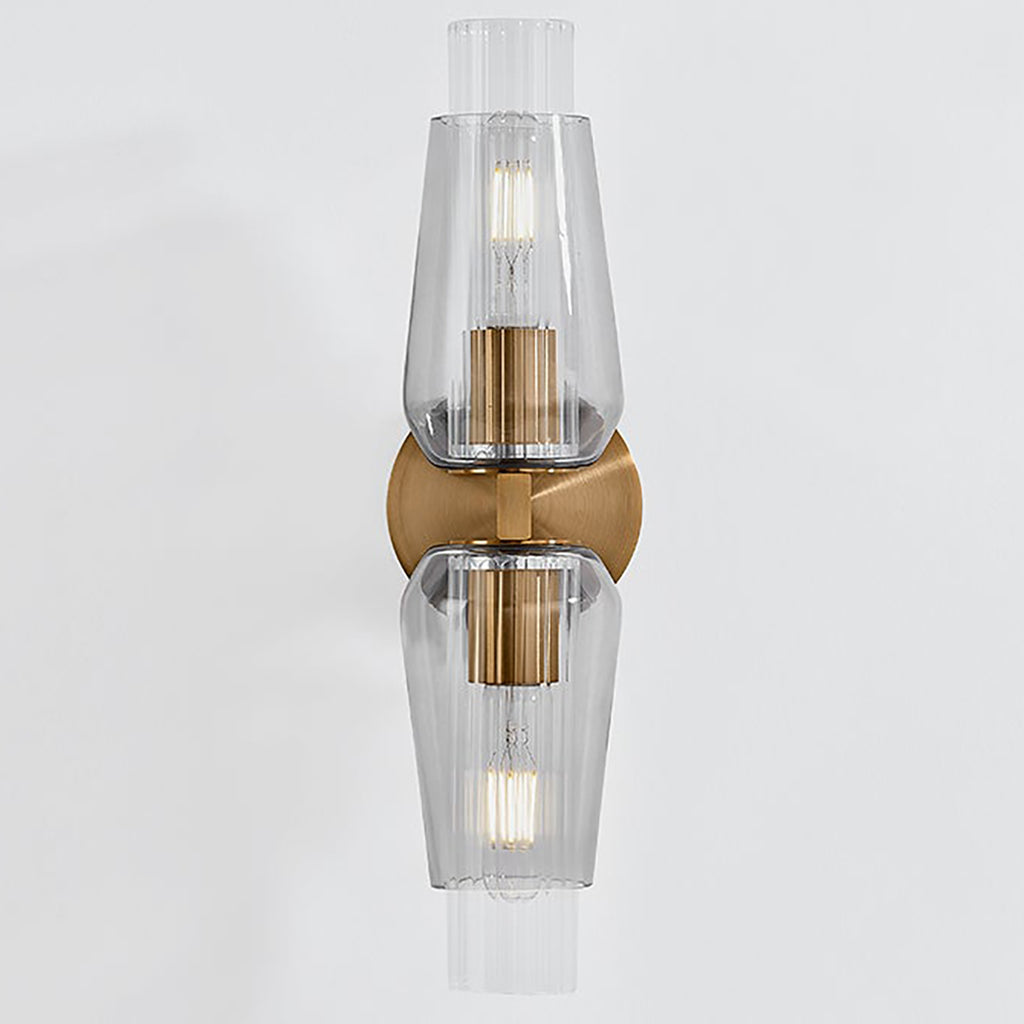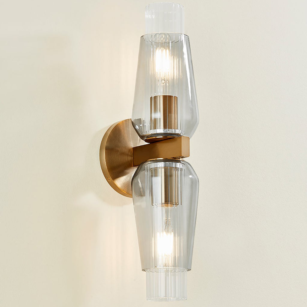 Playing with texture and form, Troy Rex Wall Sconce features a striking layered glass silhouette with a clear fluted interior and a smoke exterior. The darker glass creates an artful and soft diffusion of light while harmonizing with the rich hues of the Patina Brass finish on the metalwork. Rex is available as either a 1 or 2-light sconce.