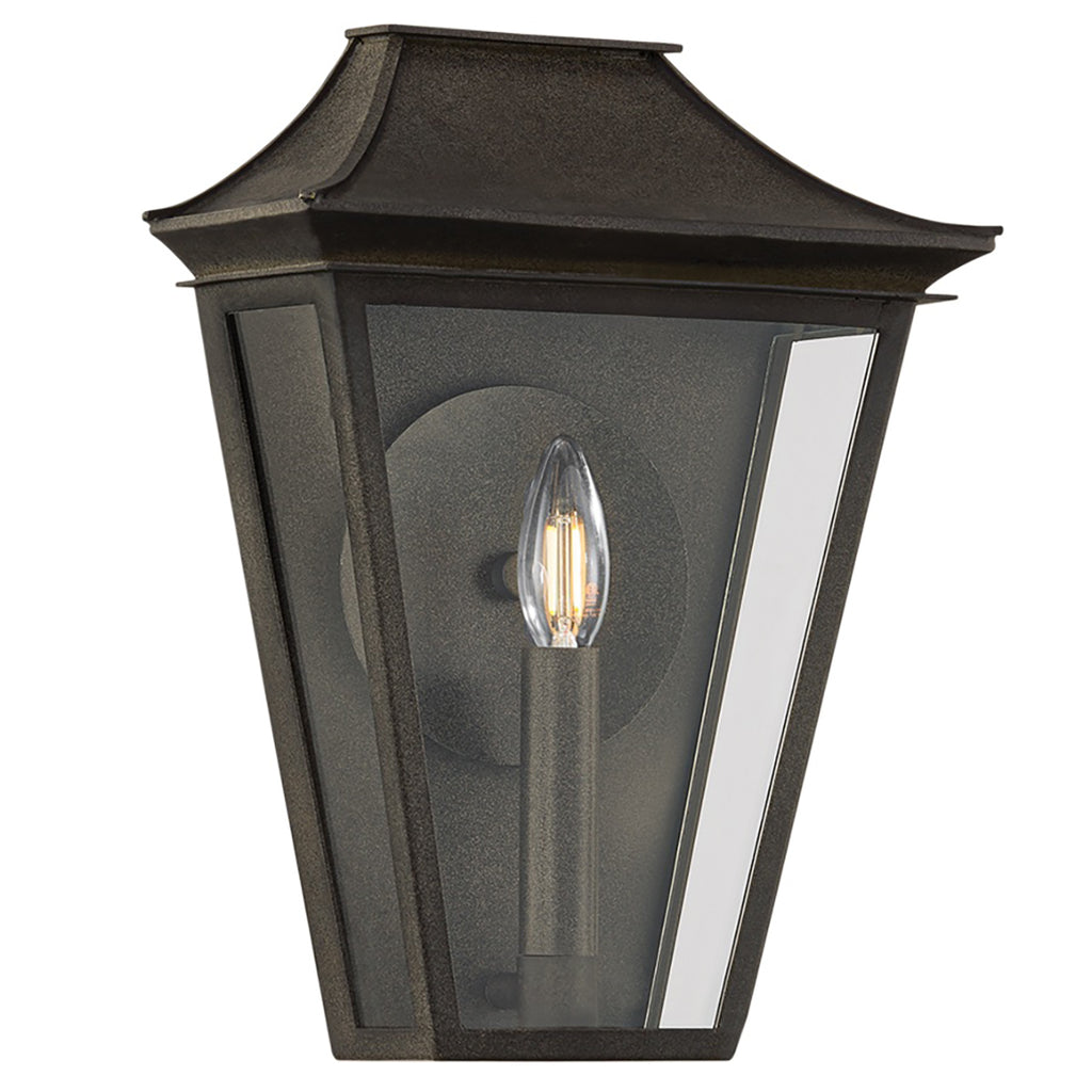 Inspired by architecture, the Troy Tehama Outdoor Wall Sconce is a showstopper. Prioritizing illumination, the reflector positioned behind the candle enhances the dispersal of light. Clear glass panes provide an unobstructed flow of light, while the angular frame and flipped edges of the roof draw the eye upwards. Available in three sizes, Tehama is finished in French Iron with a matching candlestick.