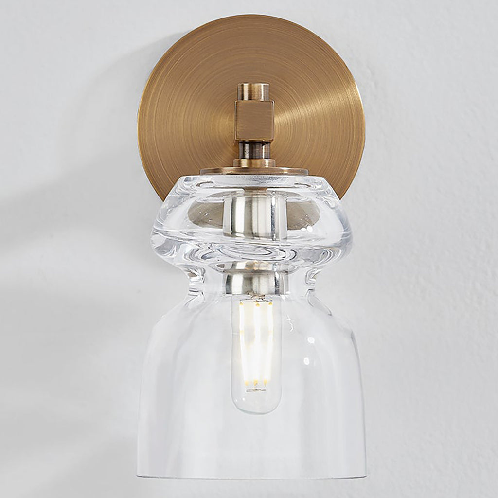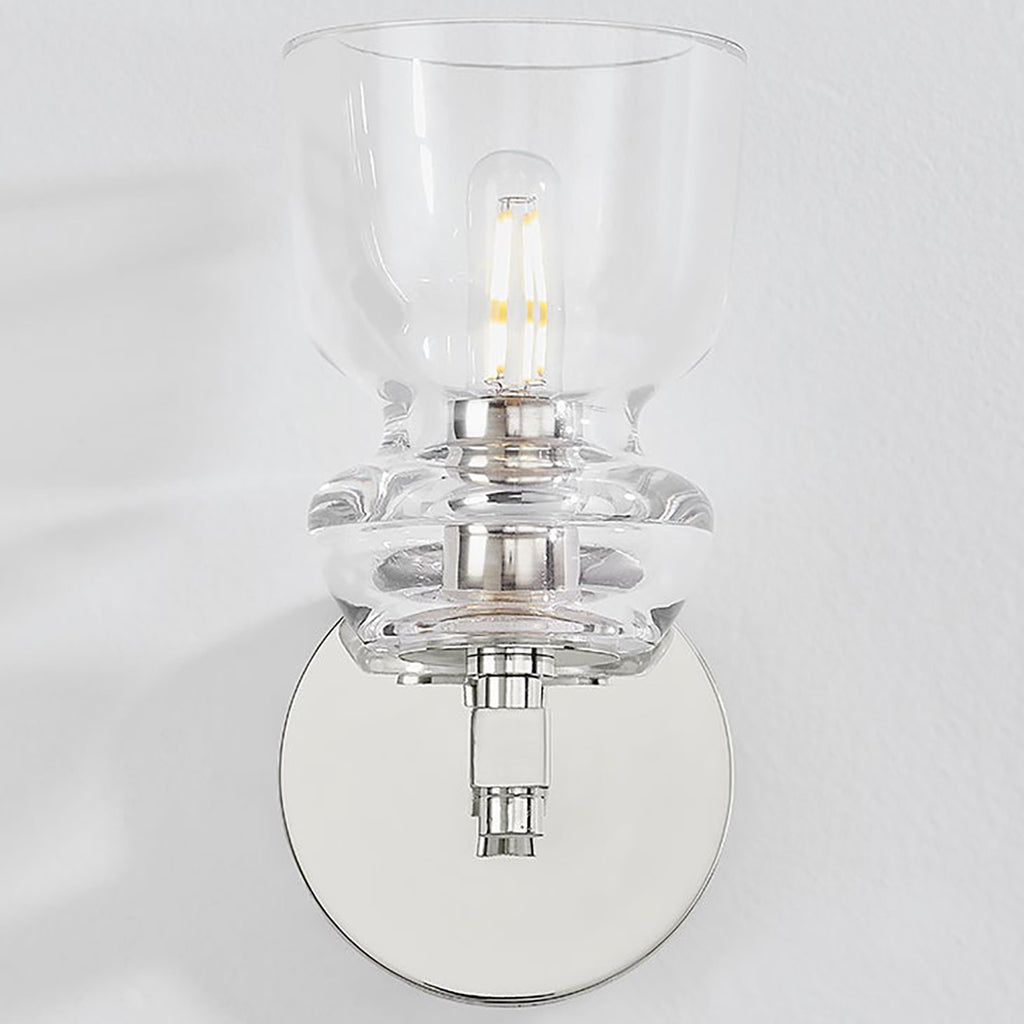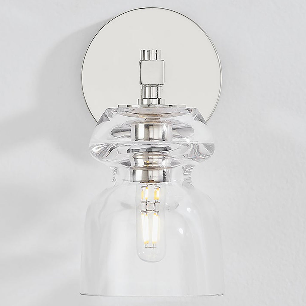 Minimal yet refined, Troy Trey Wall Sconce proportion with understated, yet significant metalwork and a thick glass shade. Crafted from Clear Glass, the shade tapers in the middle, creating an asymmetrical hourglass shape. Supporting this votive-like shade is a sleek circular backplate and rectangular metal post, which are available in a Polished Nickel or Patina Brass finish.