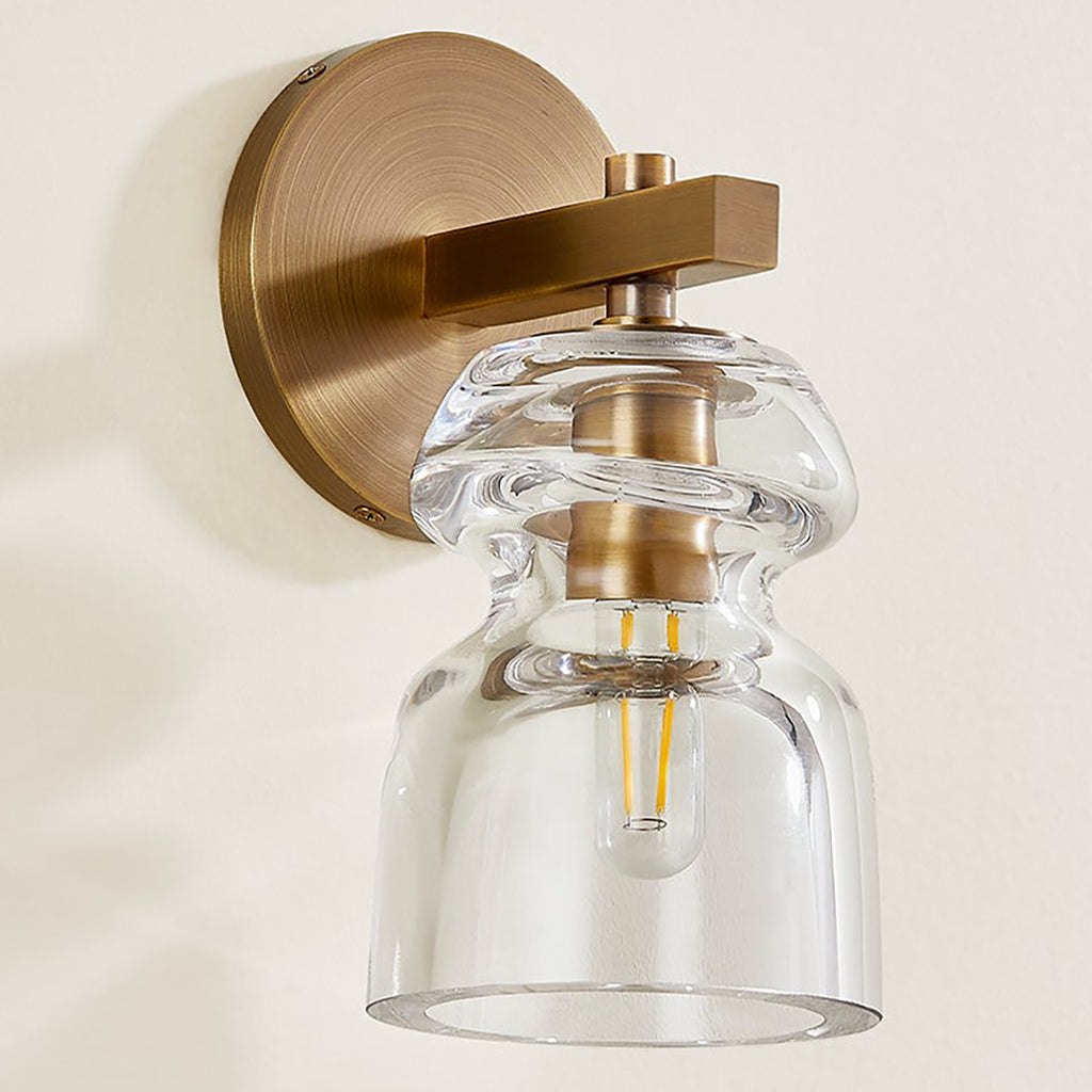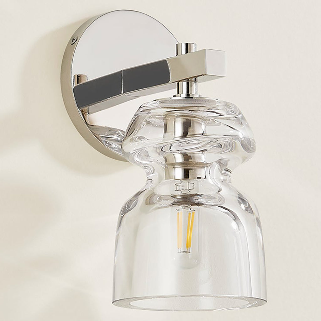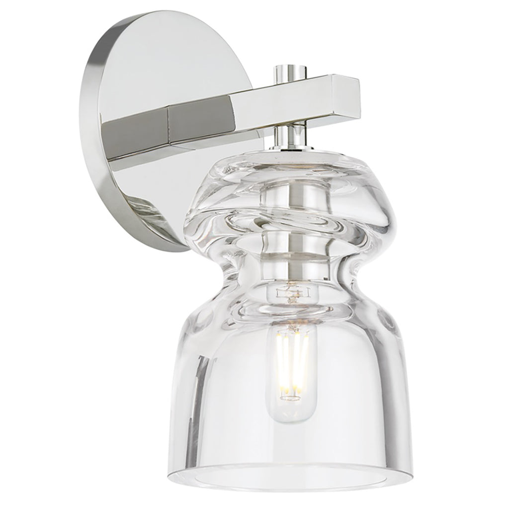 Minimal yet refined, Troy Trey Wall Sconce proportion with understated, yet significant metalwork and a thick glass shade. Crafted from Clear Glass, the shade tapers in the middle, creating an asymmetrical hourglass shape. Supporting this votive-like shade is a sleek circular backplate and rectangular metal post, which are available in a Polished Nickel or Patina Brass finish.