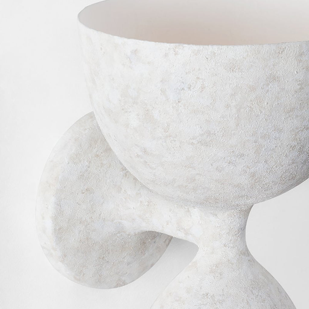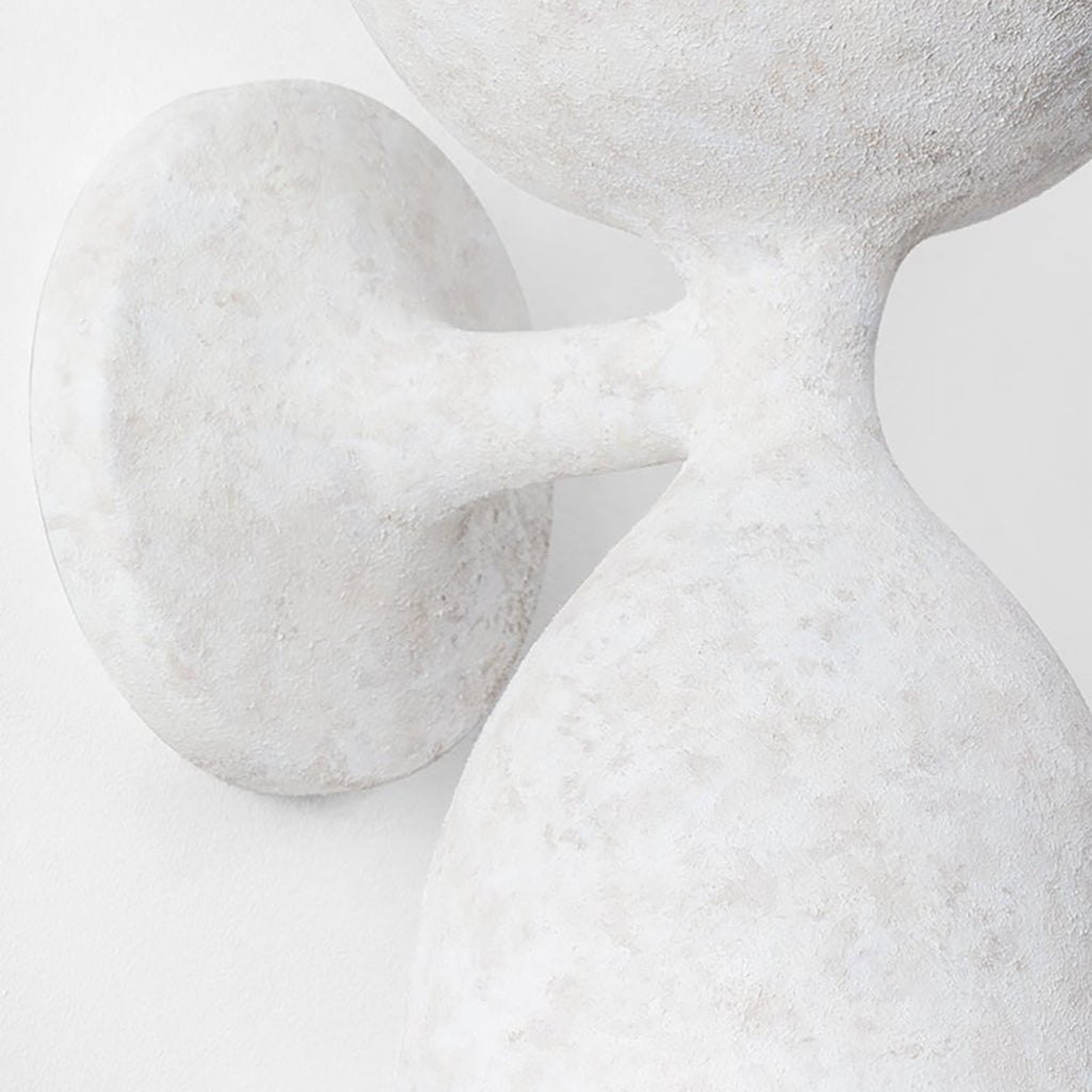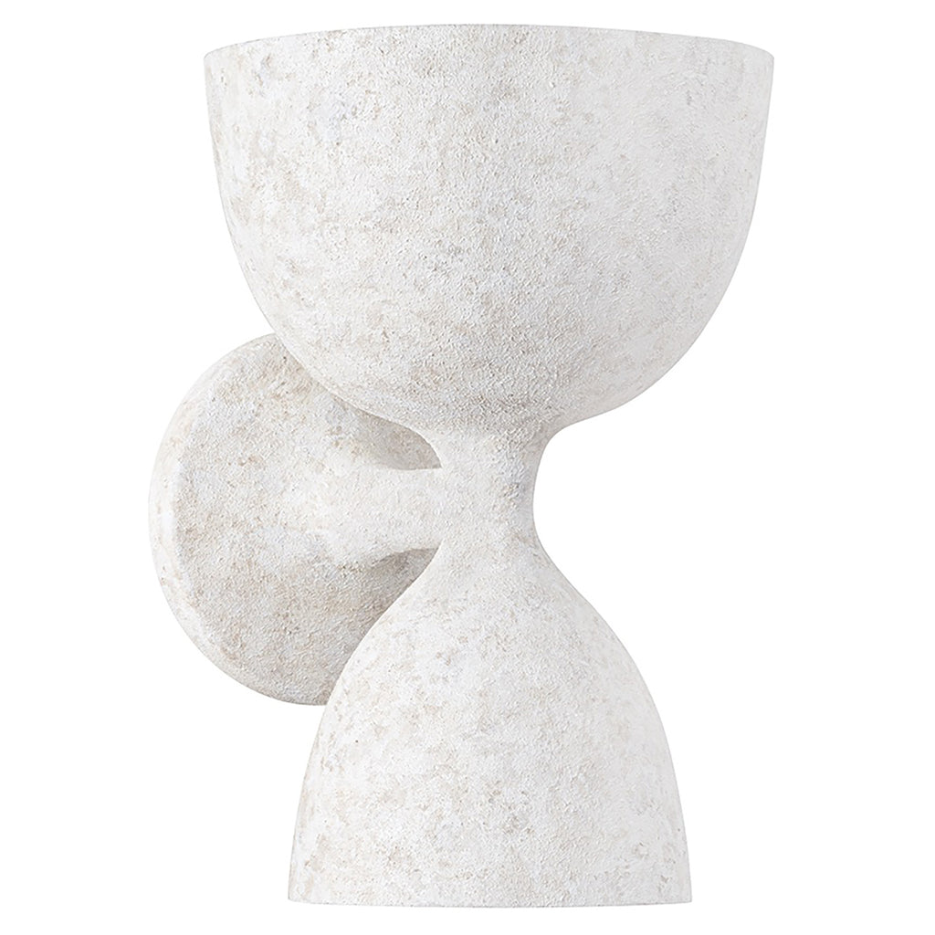 Troy Waucoba's rounded hourglass shape, textured white finish, and hand-sculpted feel give it a soothing, organic appeal. The allover Weathered White finish has a metal base underneath creating a beautiful, unique effect. Two lamps allow for both uplight and downlight; the upper lamp is slighter larger than the lower, adding to the artisanal aesthetic. Perfect in rustic, desert-modern interiors, the natural tone and familiar silhouette pair well with many other styles.
