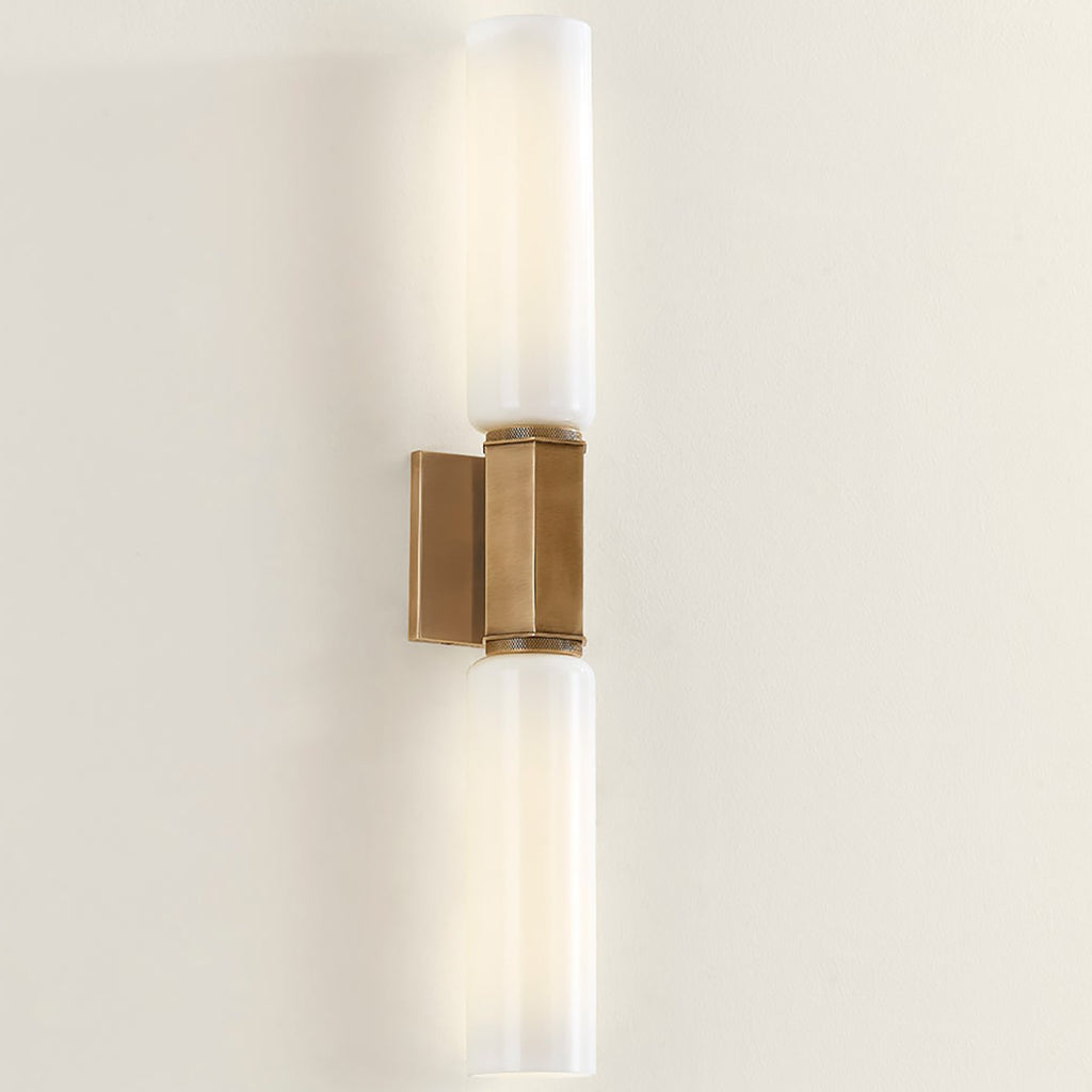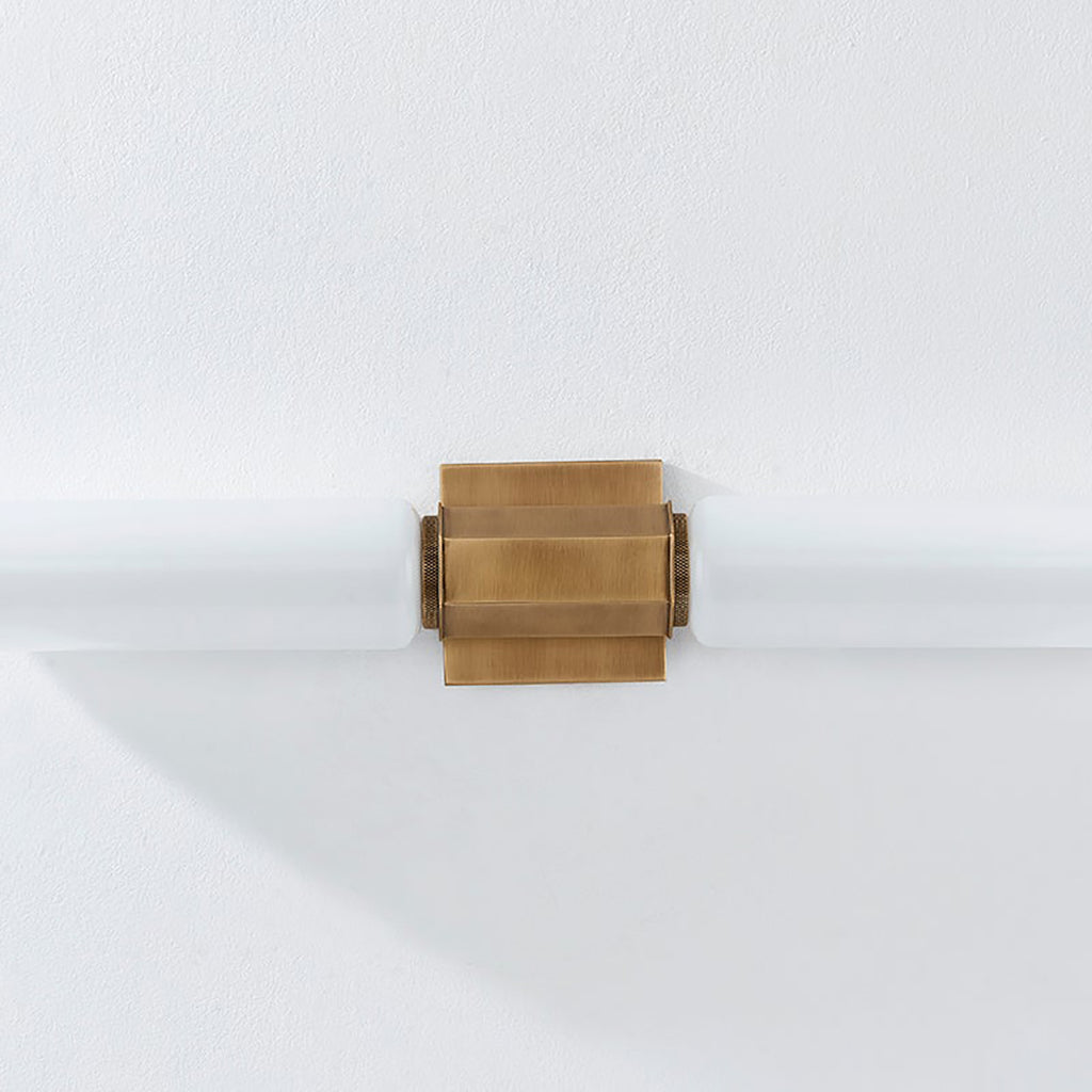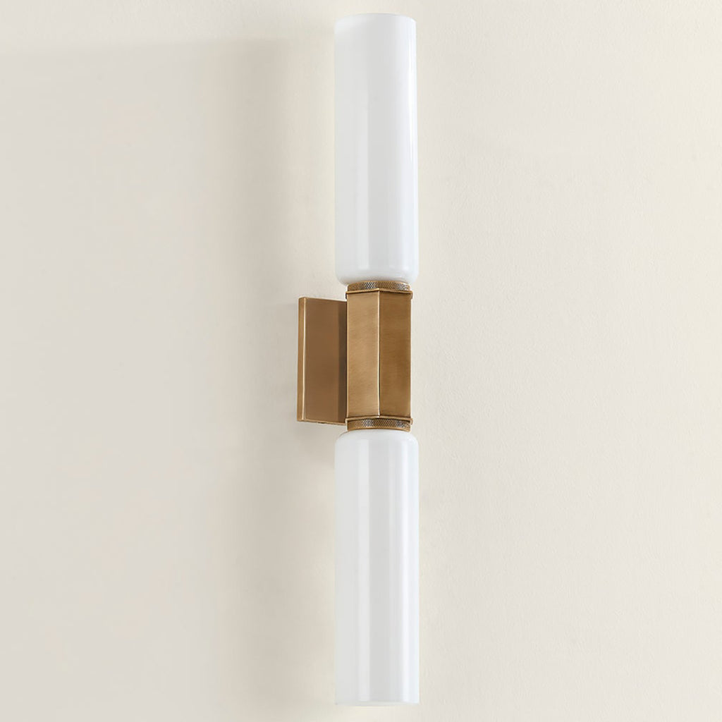 Troy Yarrow Wall Sconce makes an elegant statement with its streamlined design and attention to detail. The silhouette is constructed from two cylindrical opal glass cylinders joined in the center by a knurled and faceted Patina Brass cuff. While understated, it provides powerful illumination, making this fixture a versatile choice for many spaces.