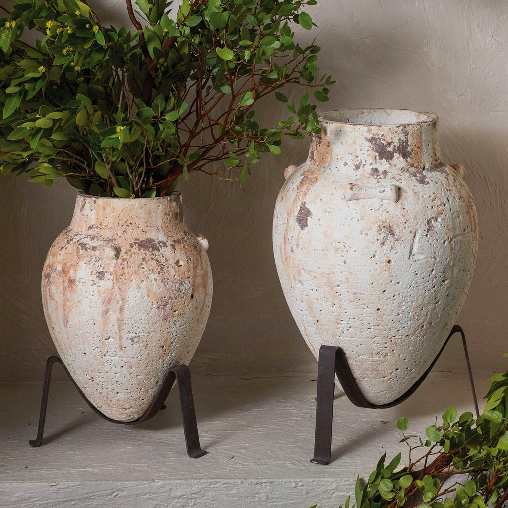 Reminiscent of ancient pottery, the Tuscan Plant Stand includes a cement vase atop an iron three legged stand. Color variations occur within each handmade vase.