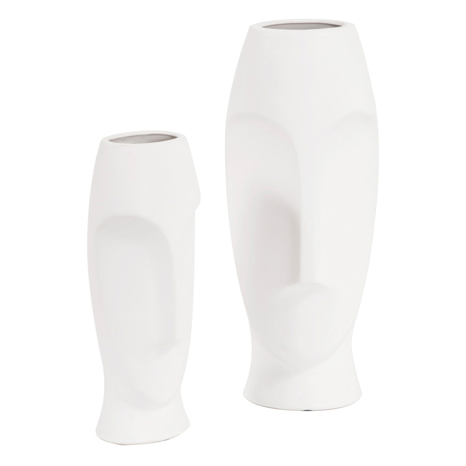 The Two Faced ceramic vase set is characterized by non descript contemporary faces finished in a matte white glaze giving the pieces a modern and mysterious look. The vase set has padded feet to protect your surfaces from potential scratching. The set includes a large and a small vase. Console tables, book shelves, pedestals or any other place that an accent is needed, are the perfect places for this vase. Vases can hold water.