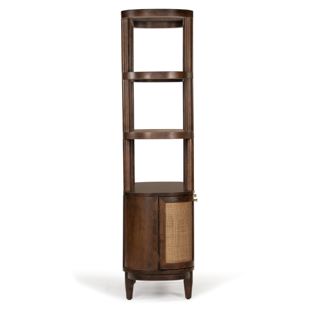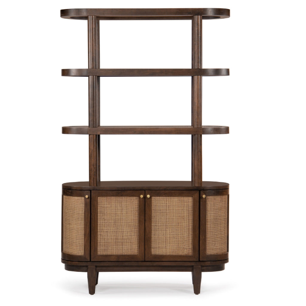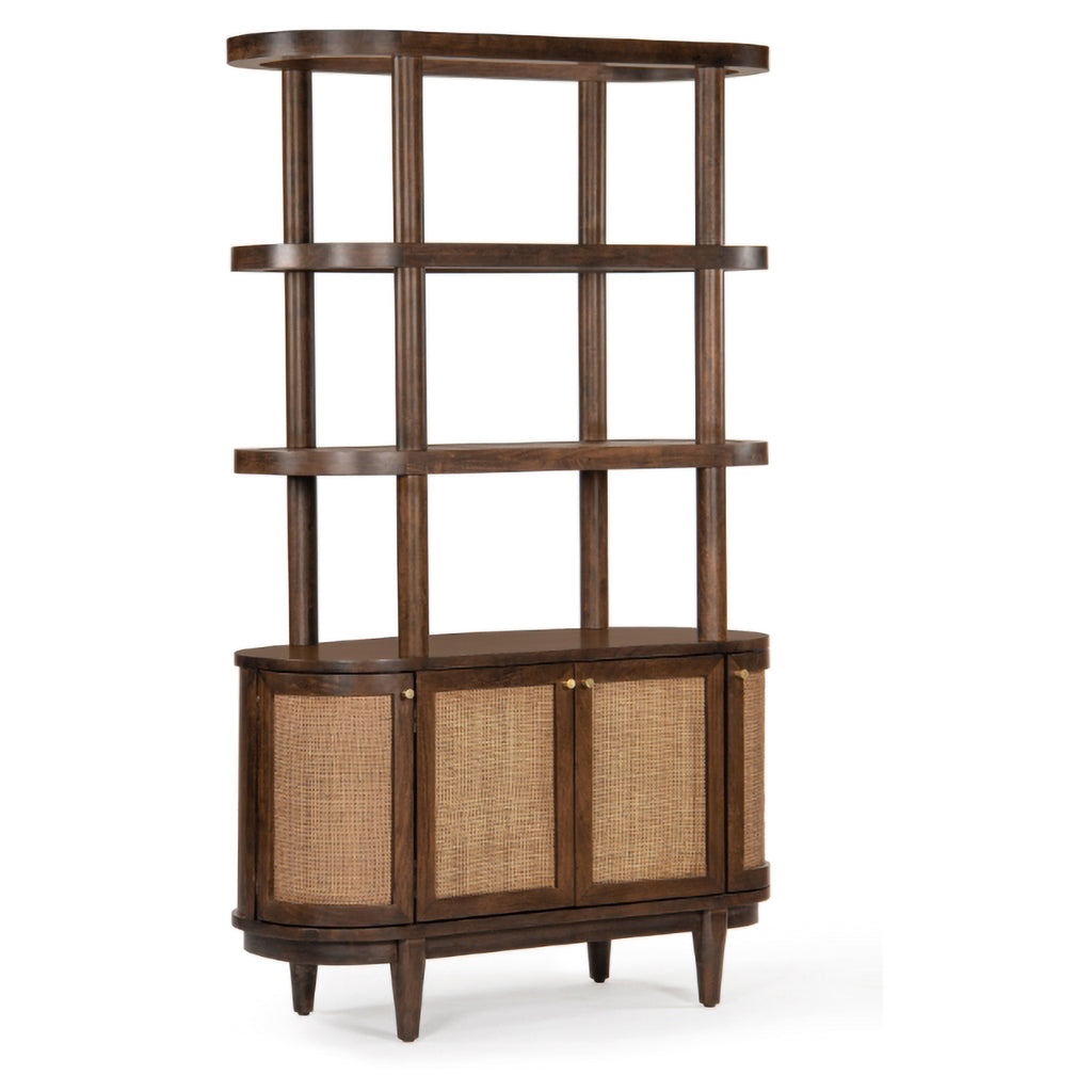Embracing curves and a natural mix of materials, the Canggu Shelving features a plantation grown Acacia case and frame, as well as natural, woven cane shelves and doors. At the base, 4 hinged doors provide concealed storage, while 3 open shelves are the perfect place to display keepsakes, books or objects d’art.