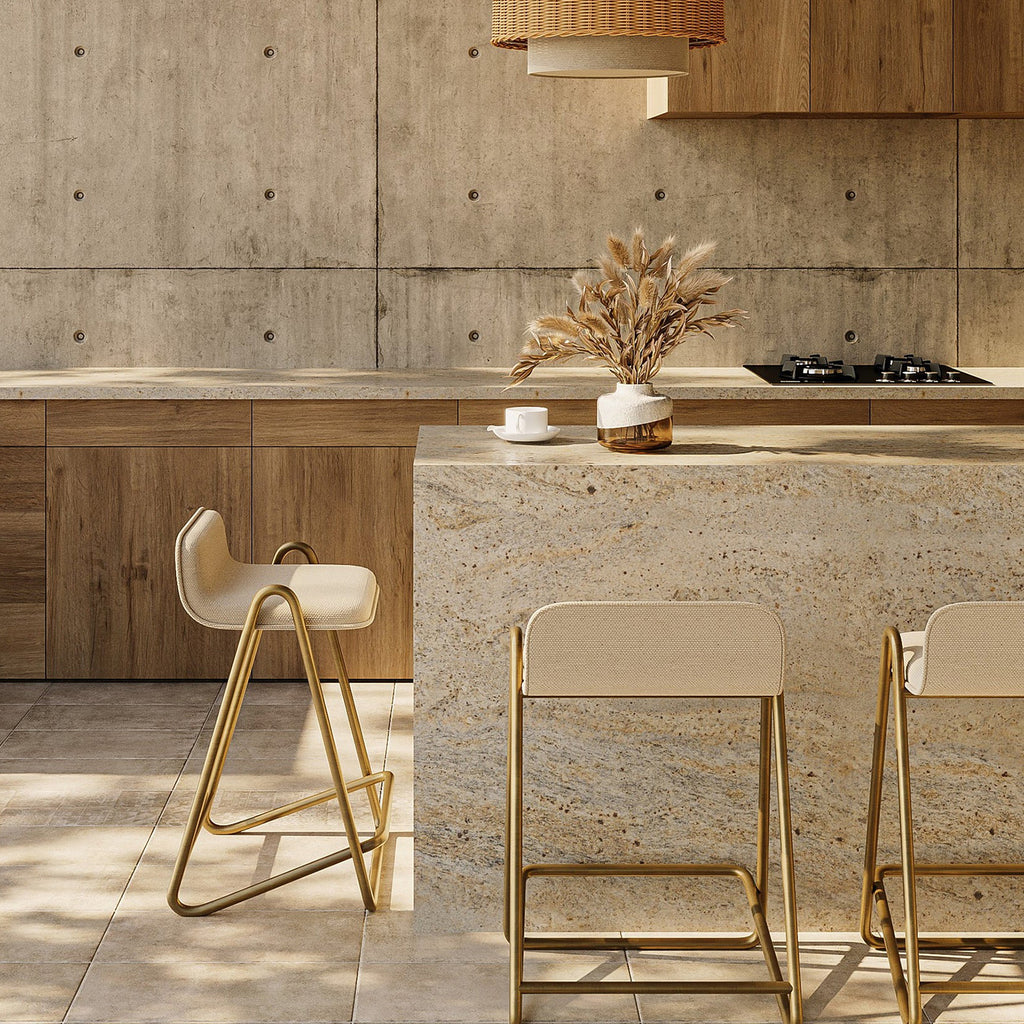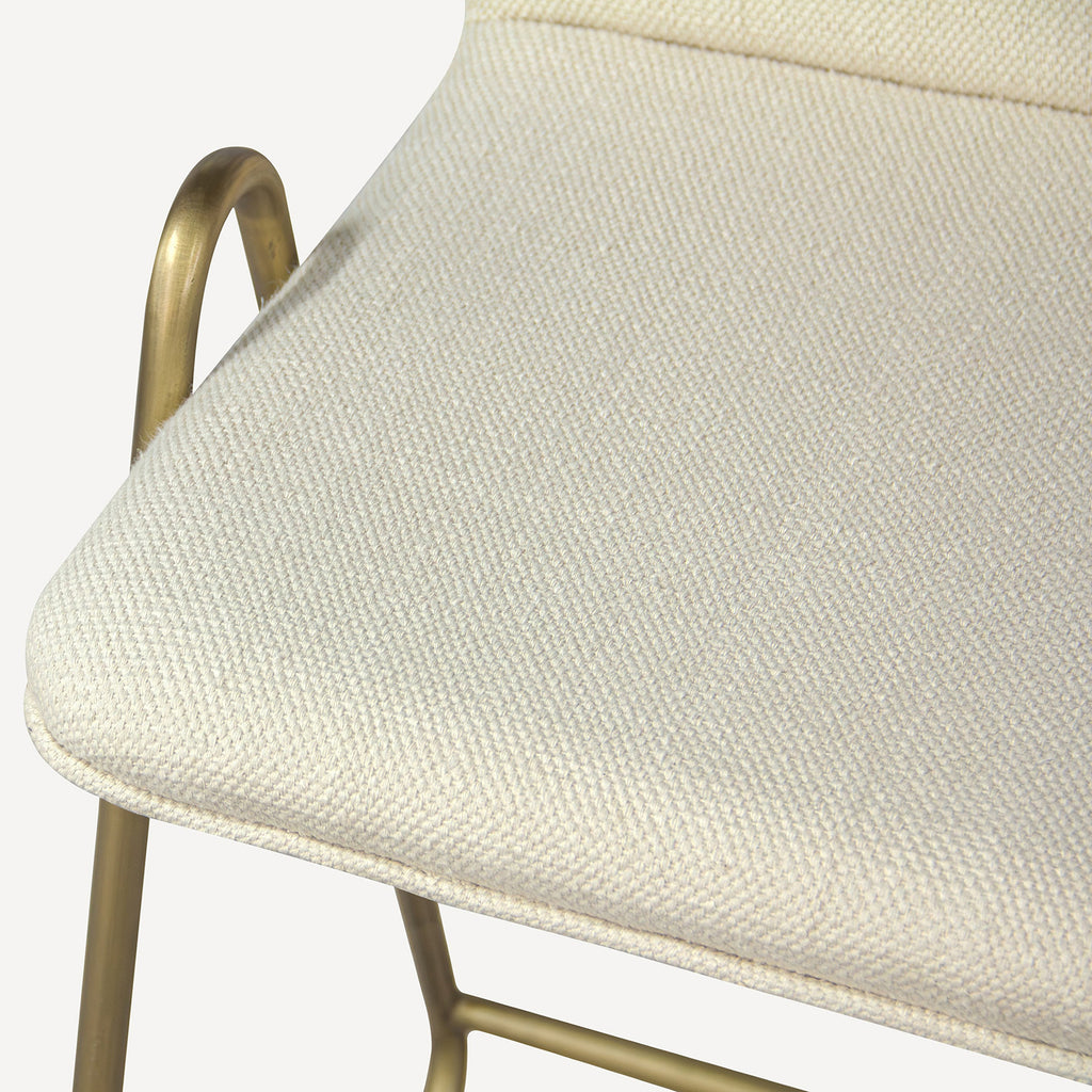 A soft modern take on the pub classic, the Corsica counter stool is defined by its softly upholstered seat and radiused steel leg frame. Designed to sit comfortably in both modern and traditional room settings, the natural, cotton Dhurrie upholstery and the antique brass frame add warmth and style to any space.