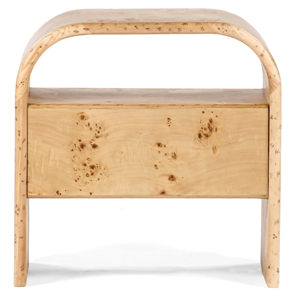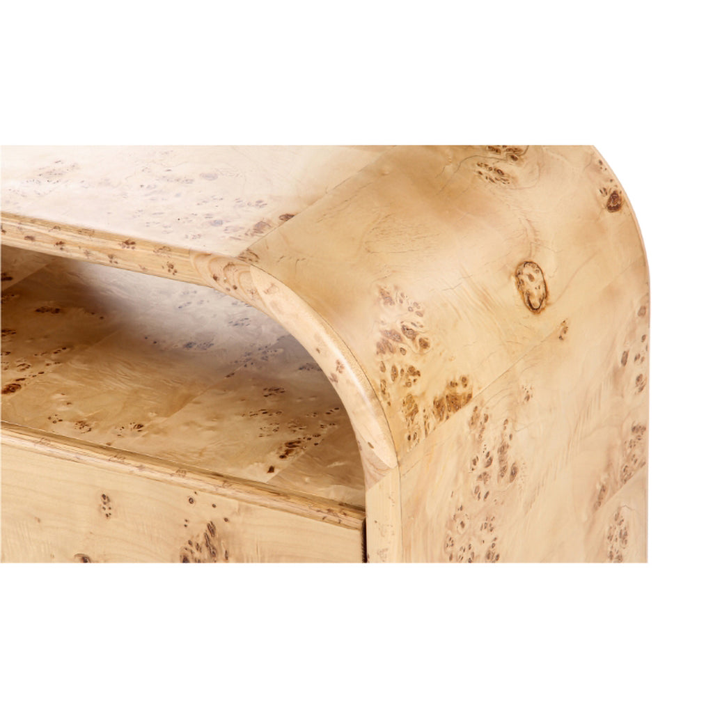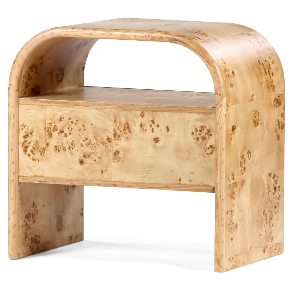 The Liam Nightstand is a sculptural nightstand made in Burl veneer. Its curved top and clean design adds a simplistic charm to your bedroom. Disclaimer: The natural burl patterns may vary from the imagery provided, resulting in unique product variations. Please note that no two products will be identical due to these natural variations.
