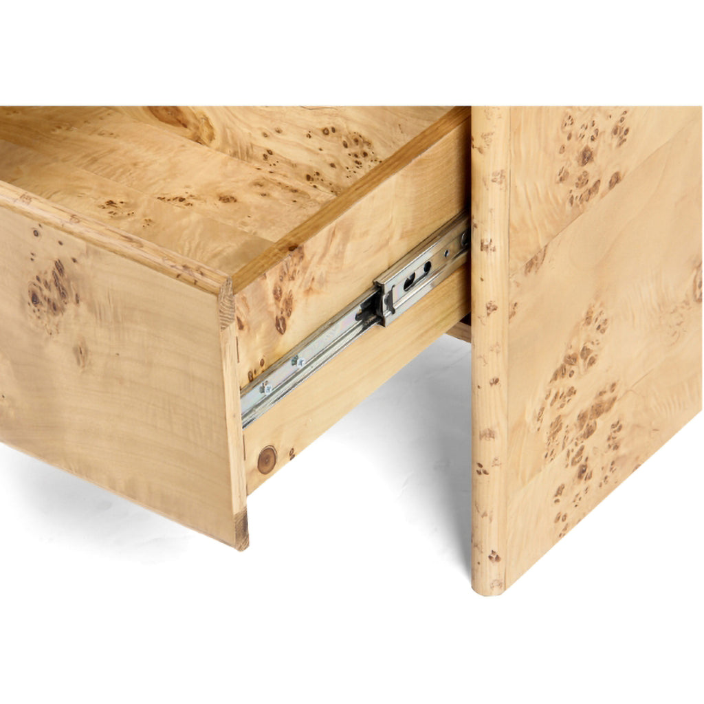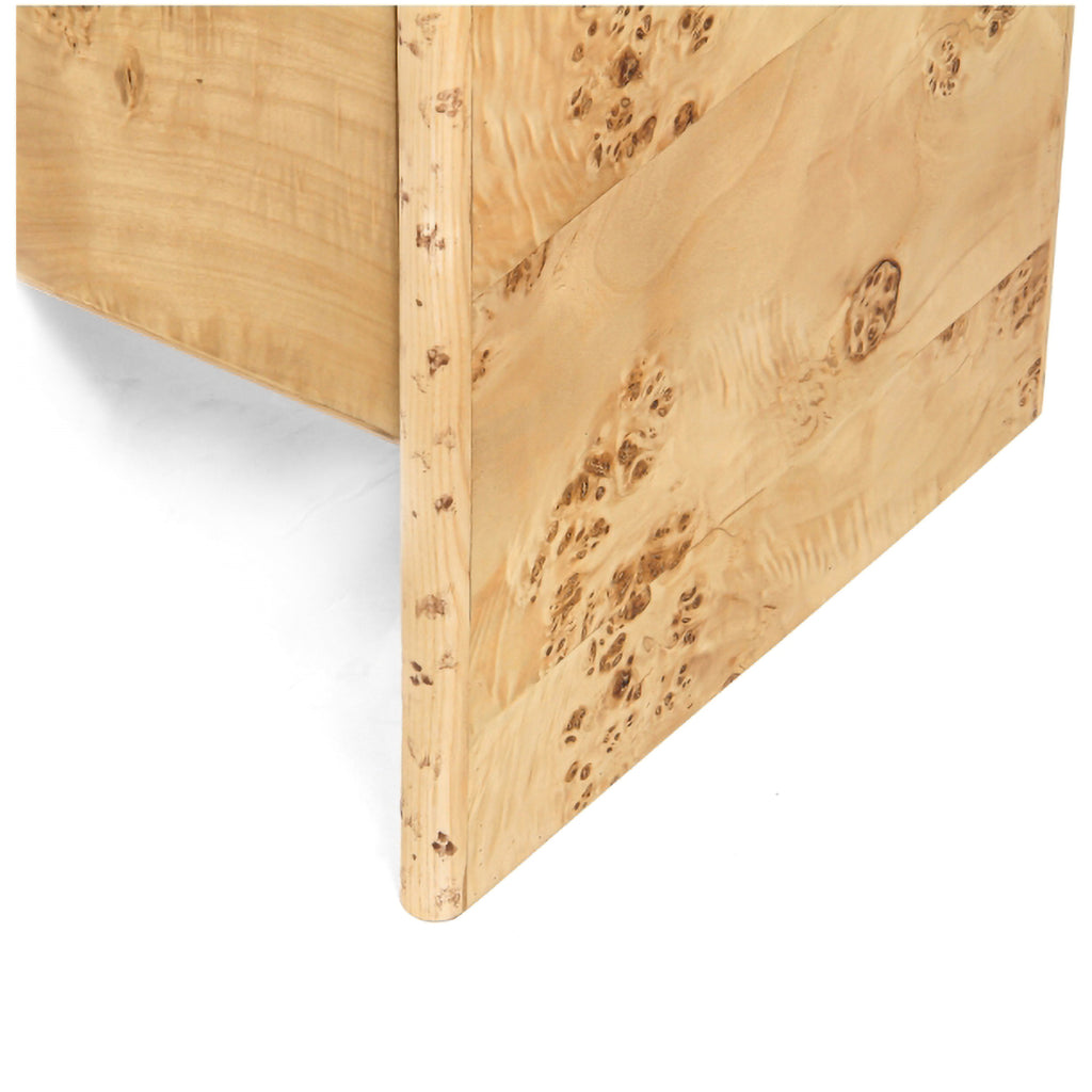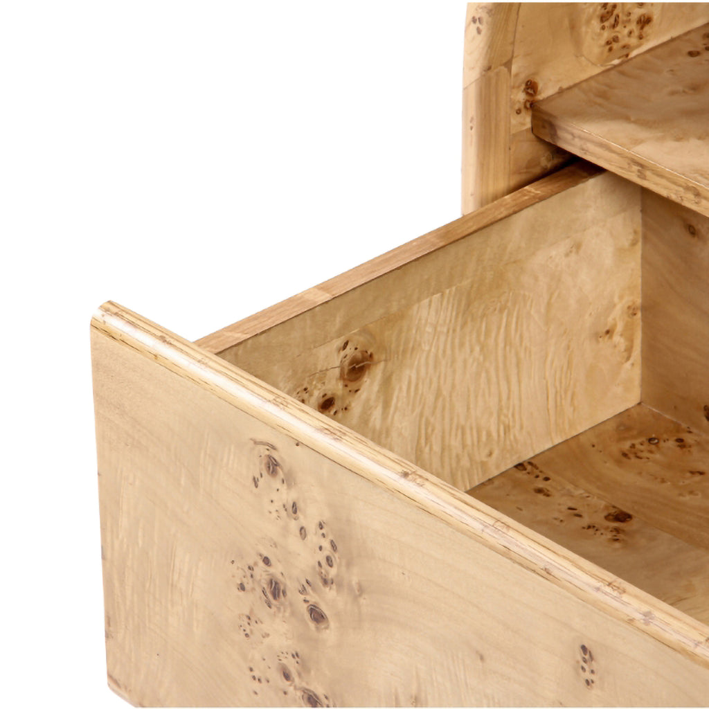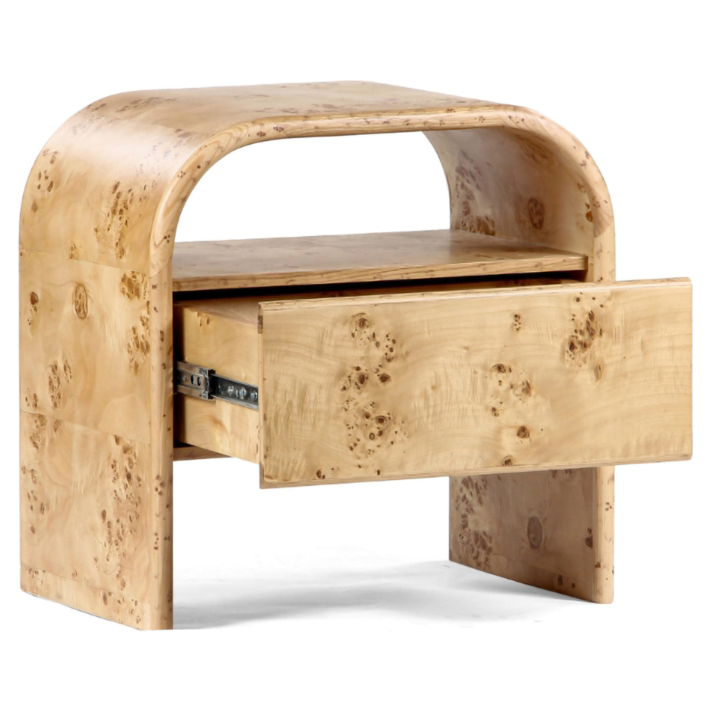 The Liam Nightstand is a sculptural nightstand made in Burl veneer. Its curved top and clean design adds a simplistic charm to your bedroom. Disclaimer: The natural burl patterns may vary from the imagery provided, resulting in unique product variations. Please note that no two products will be identical due to these natural variations.