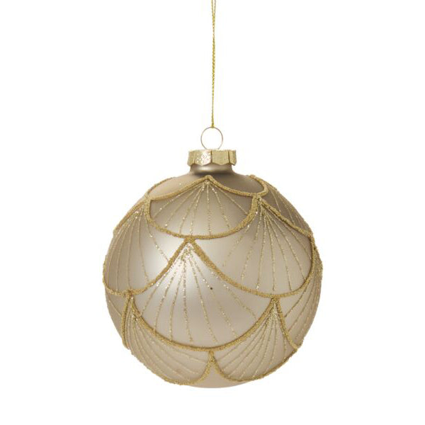 Scalloped curves lined in glitter outline the surface of the Uroko Ornament, a soft gold bauble that brings a bit of sophisticated shine to the tree. Available in two sizes, these styles layer in beautifully with other metallic tree decor. With a small gold cap and metallic gold string, this classic ornament will shine brightly.