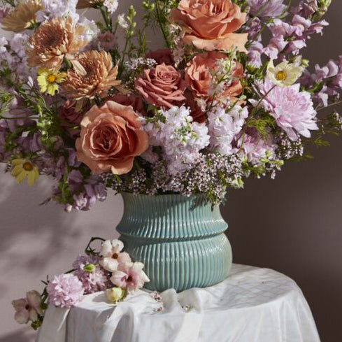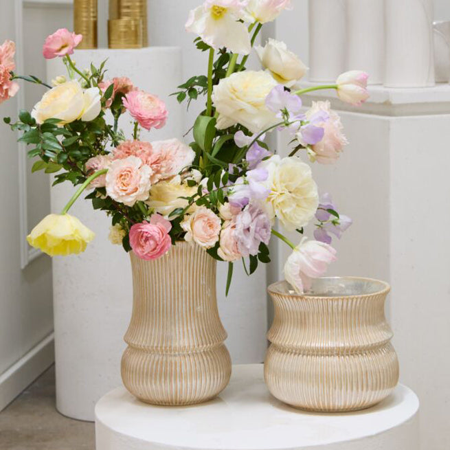 With delicate curves & interesting ribbing, the ceramic Verdant Pot gives drop-in plants an eye-catching home to thrive without overpowering. With its larger scale & off-white opalescent finish, this versatile pot is ideal for both plants or vibrant florals & pairs nicely with both Verdant Vase & the green colorway for everyday or event displays.