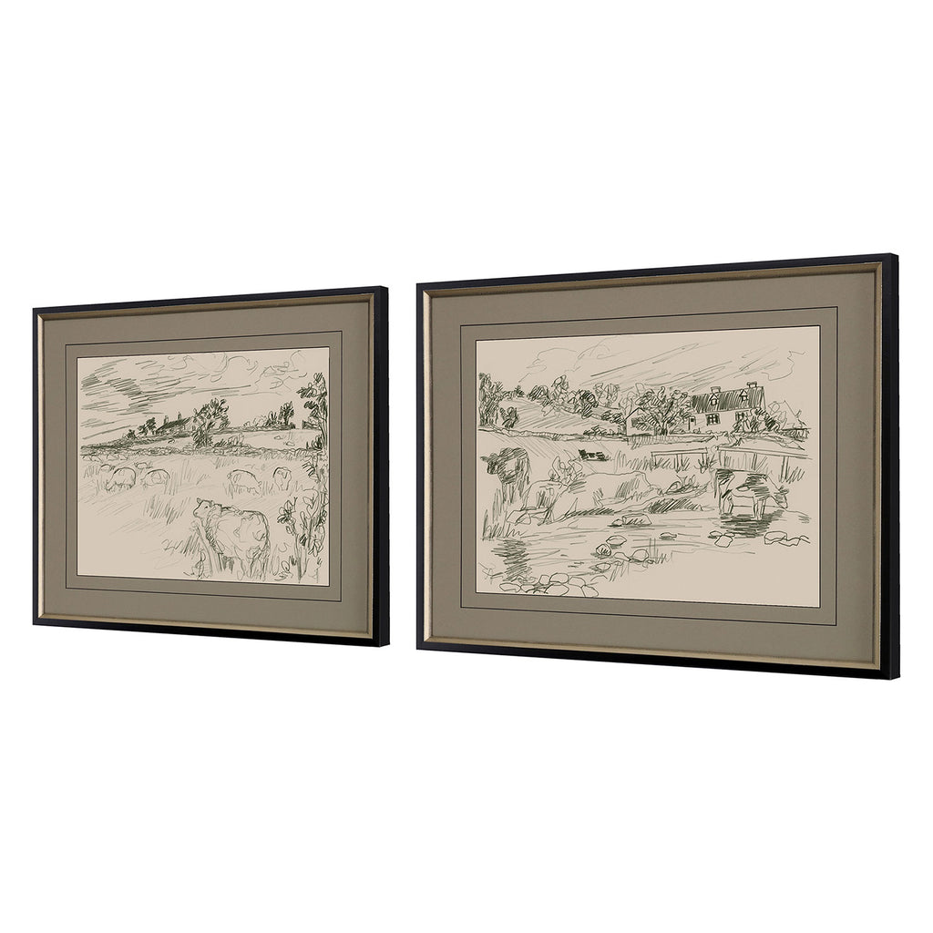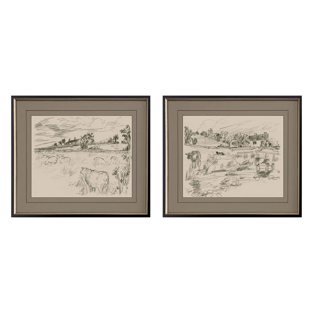 Pastoral scenes in sepia tones are matted in moss. Framed in a black painted wood with distressed silver leaf inner slope. Sold as set of two.