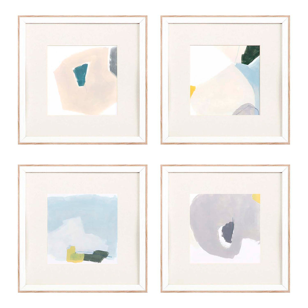 Playful abstracts are matted in taupe. Framed in a ribbed white wood molding with blonde wood finish side. Sold as set of four.