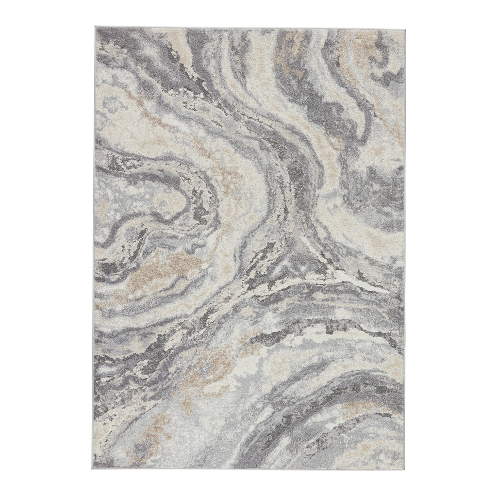 Serene hues and industrial style meld together to define the fresh, contemporary appeal of the Ferris collection. The Gatlin design features a natural-inspired abstract motif in tones of gray, cream, and hints of beige. This plush rug boasts added texture with carved, high-low details throughout the durable polyester and polypropylene pile.