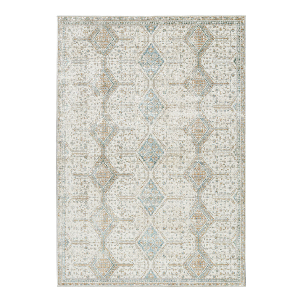 The glamorous yet versatile style of the Vibe by Jaipur Living Melo collection offers a chic, contemporary edge to any home. The Roane rug boasts an intricate trellis motif in tones of ivory, gold, blue, green, and gray. This power-loomed collection features a stunning lustrous sheen and texture-rich, varied pile height for added dimension and depth.