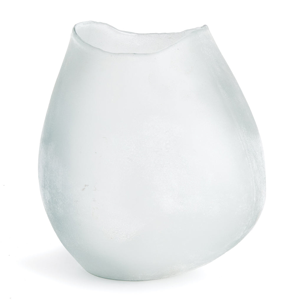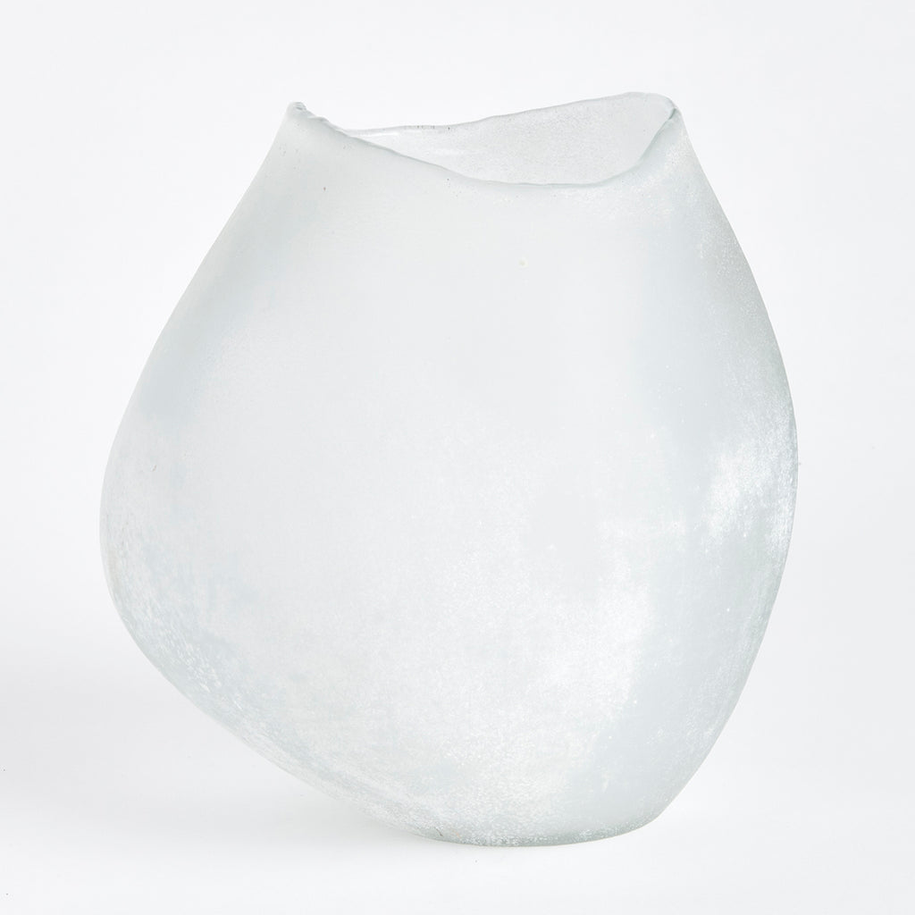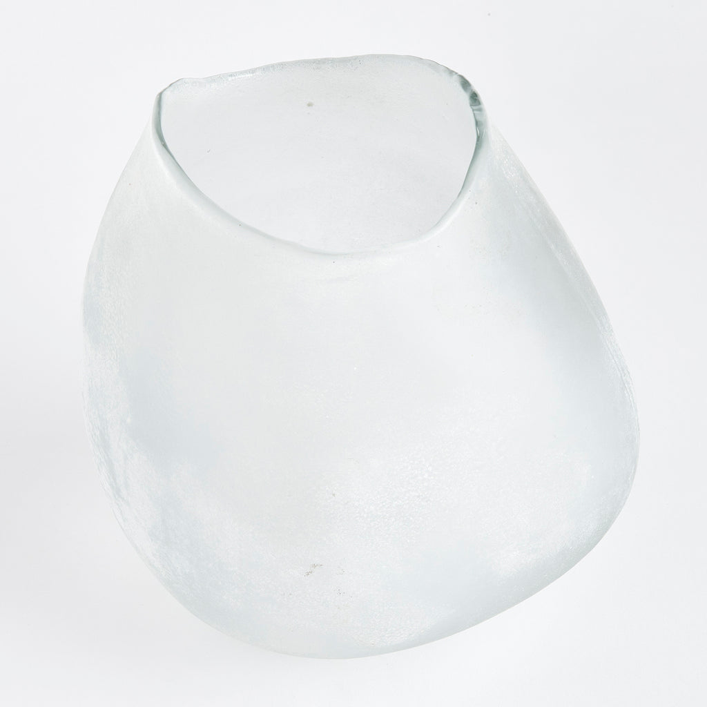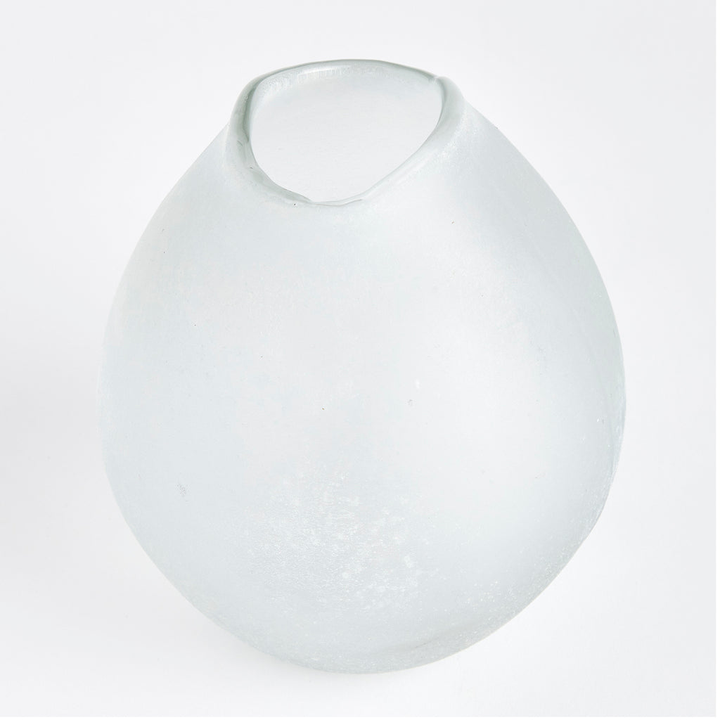 Nature-inspired, this hand blown glass vase has a bulbous shape and melted edge rim detail. The frosted glass only adds to its appeal. A beautiful addition to bookshelf, mantel or side table.