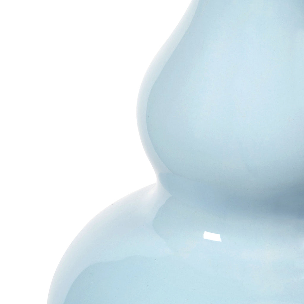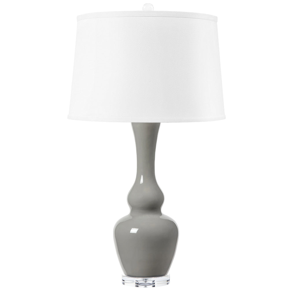 The Villa and House Ansonia Lamp has a thin double-gourd silhouette complemented by a long, slender neck, creating a graceful and timeless profile. Crafted from ceramic with a glossy opaque glaze, the lamp exhibits a polished finish. It rests on a clear acrylic base and is topped with a matching acrylic ball finial, adding a touch of modernity. The nickel harp completes the design, ensuring both style and durability.