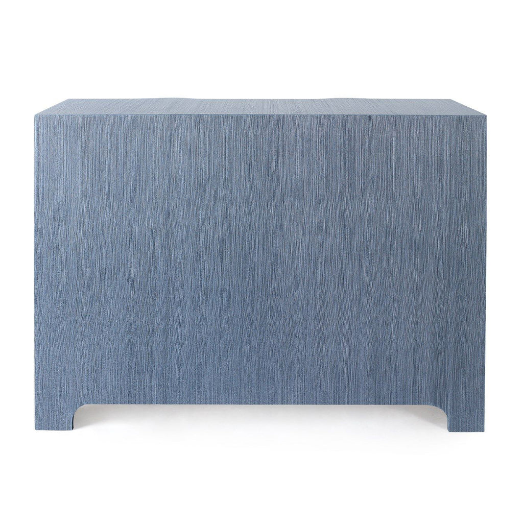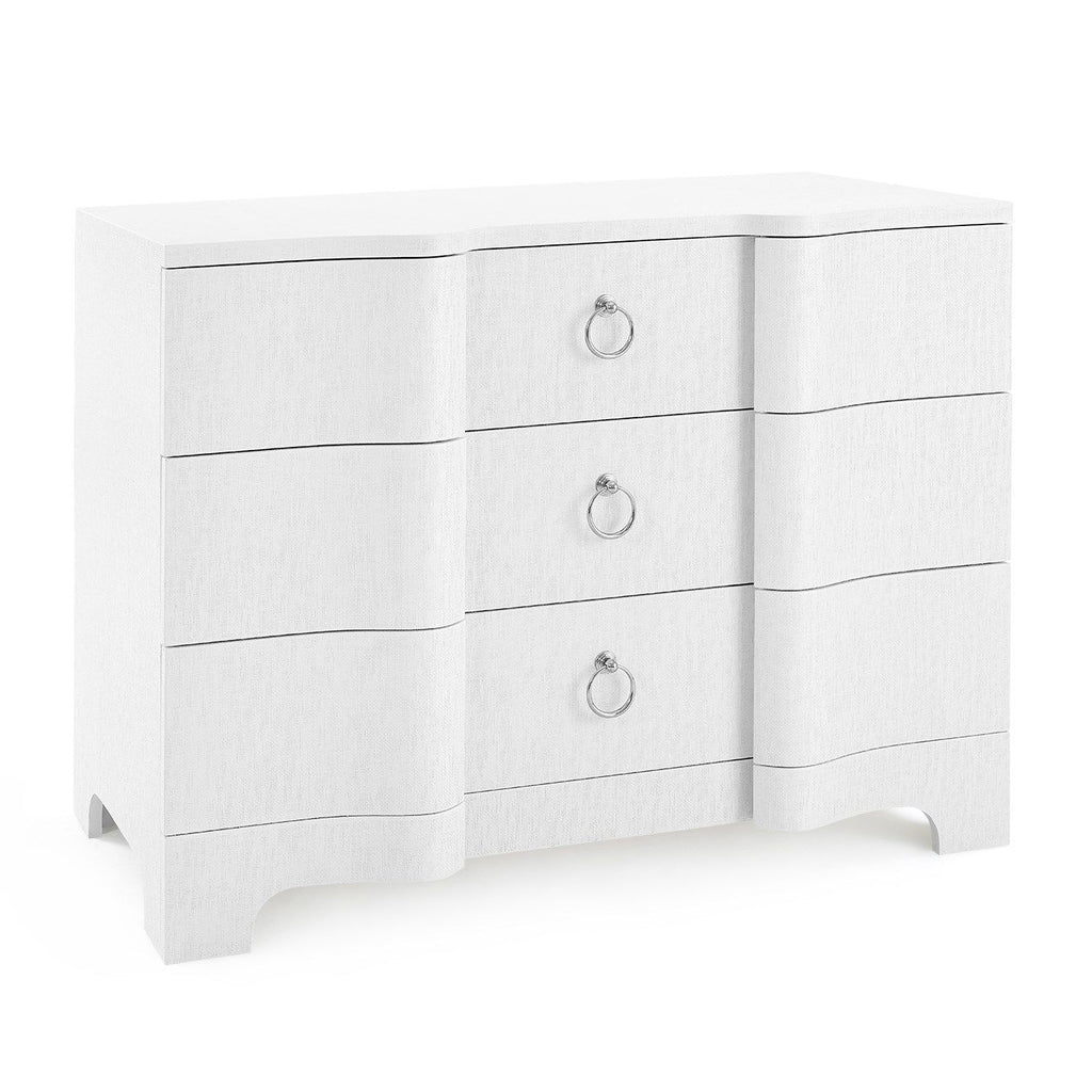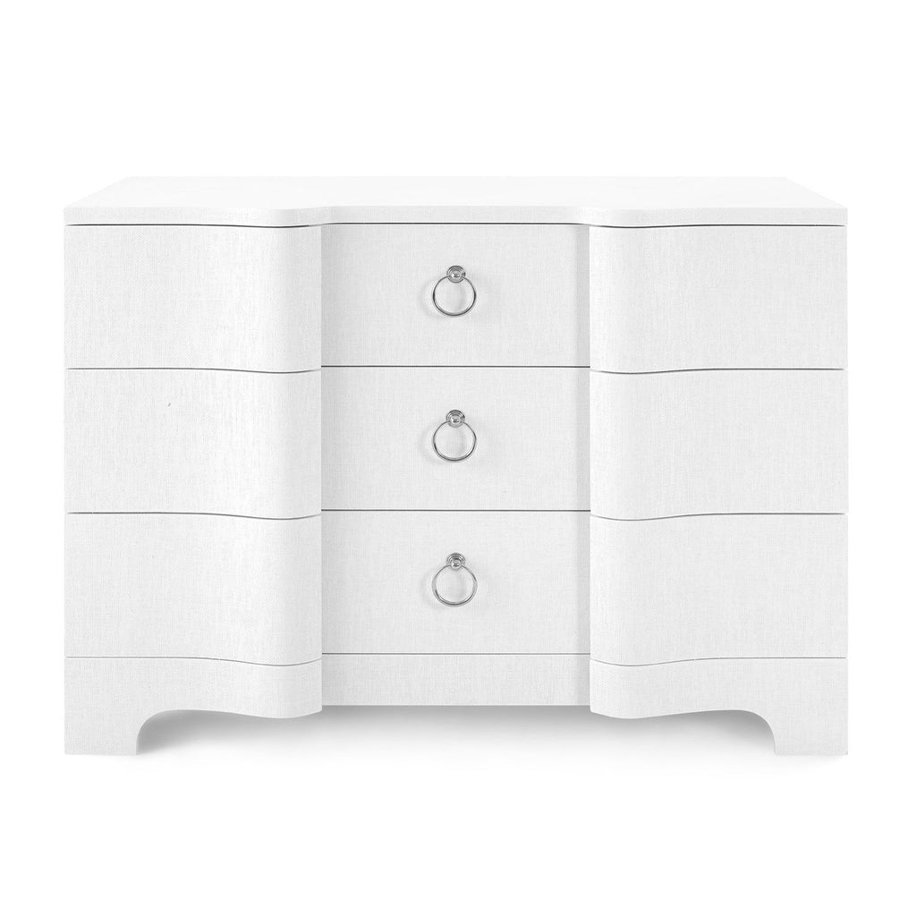 The V&H Bardot Collection is a curvy, Art Deco-inspired design with a serpentine-front profile that imparts a sense of movement and fluidity. The lacquered grasscloth has been expertly applied by our skilled artisans so that it flows seamlessly over each cresting drawer front and around each corner. This piece appeals to those who want polished, decorated rooms.