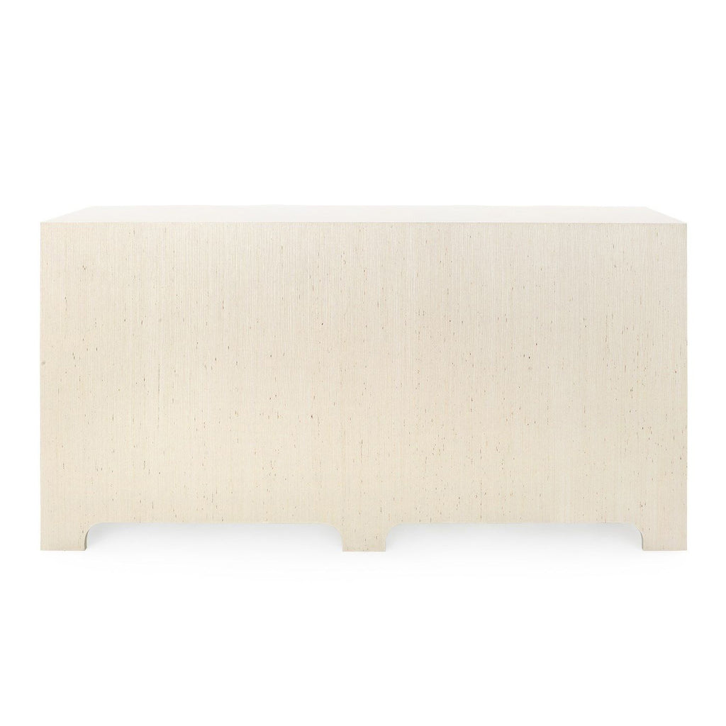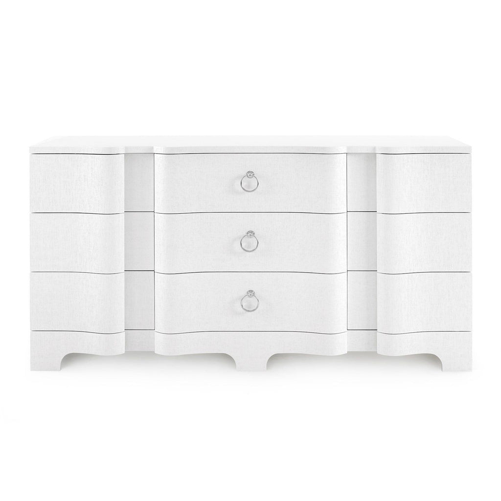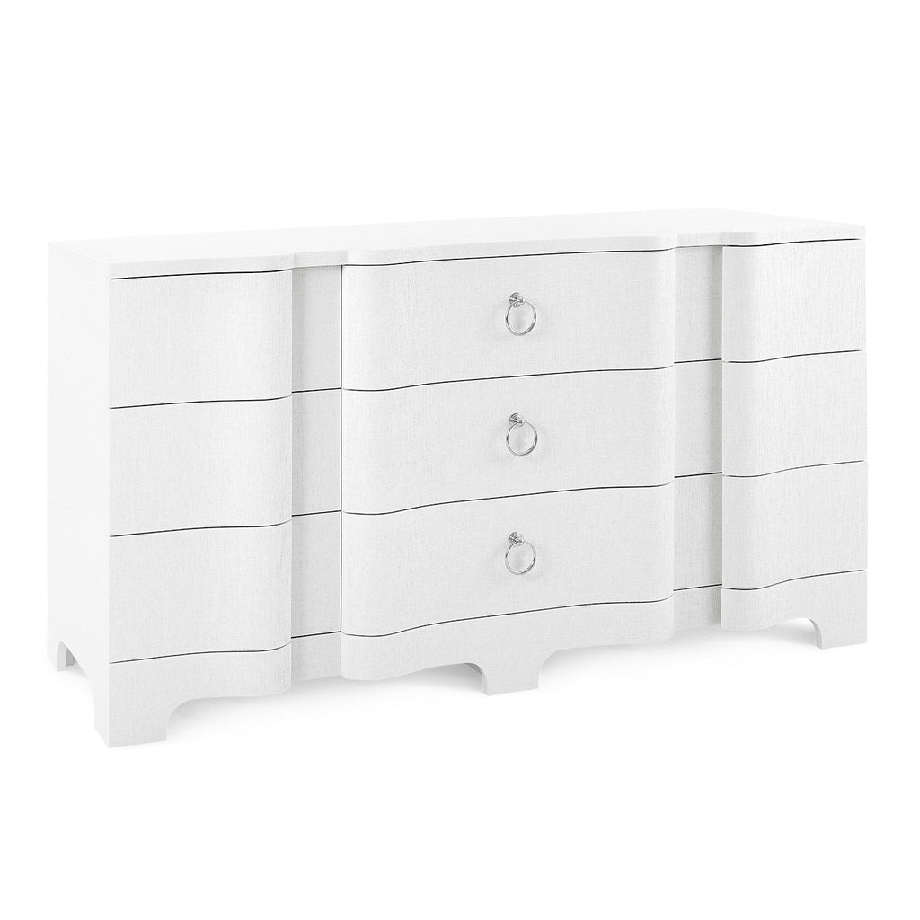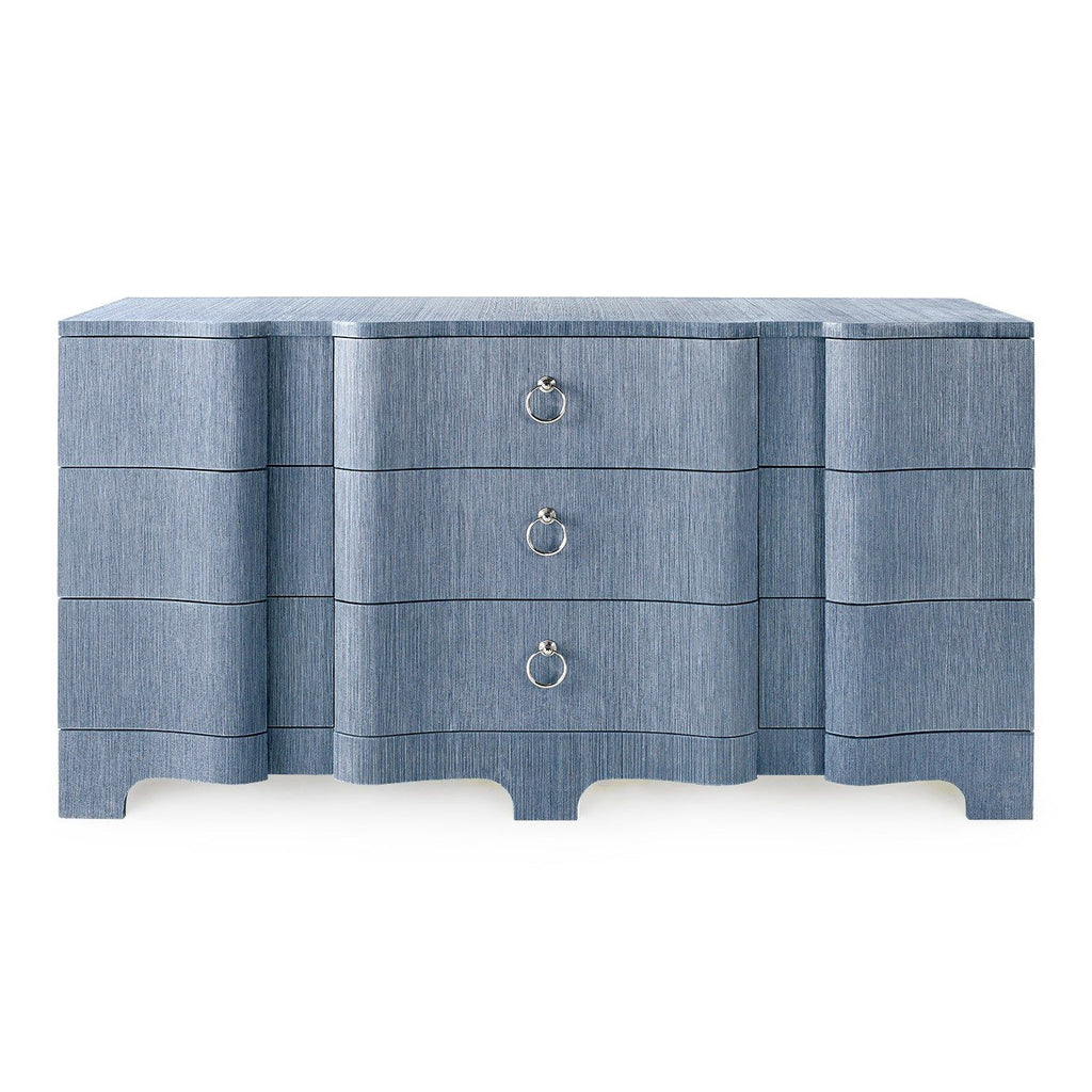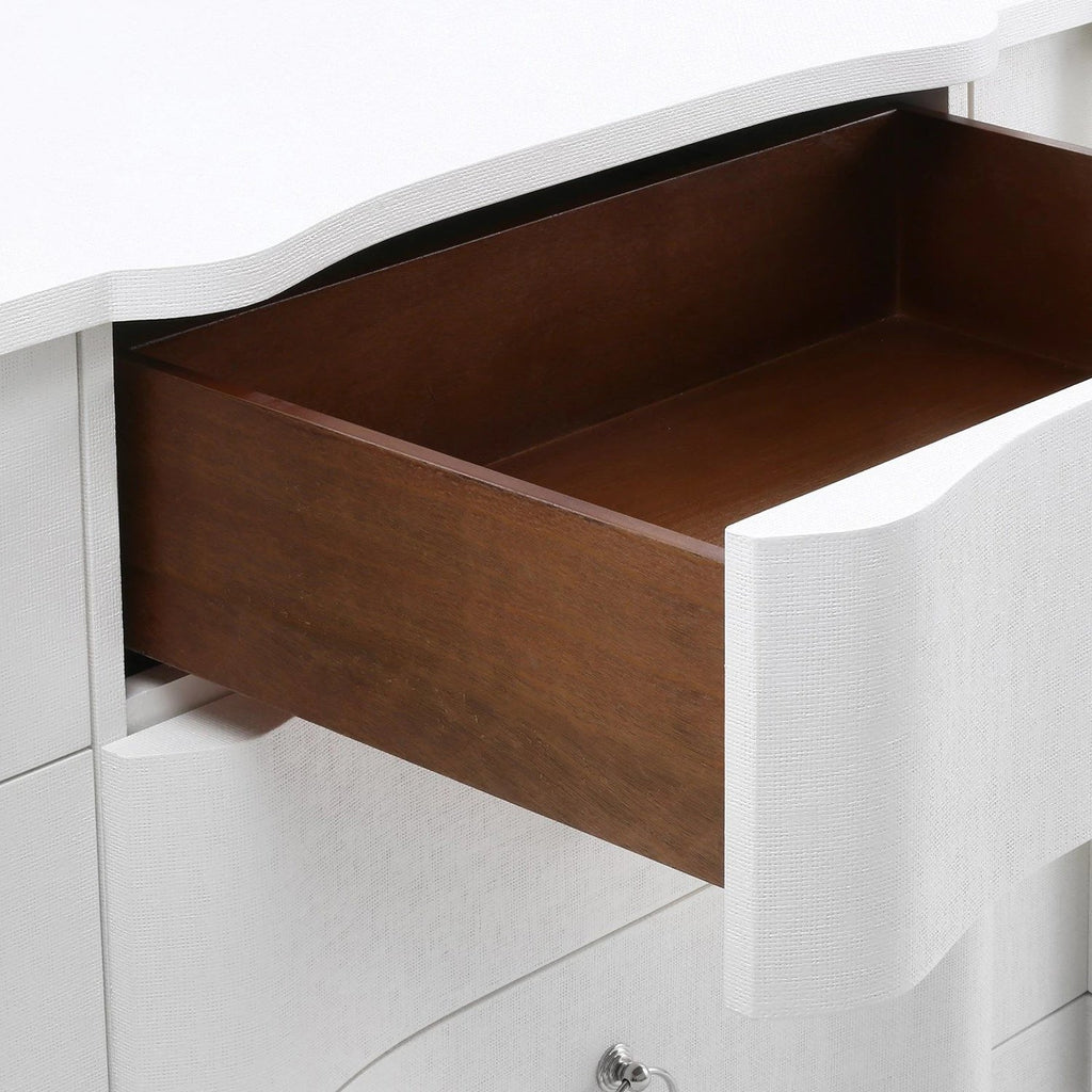 The V&H Bardot Collection is a curvy, Art Deco-inspired design with a serpentine-front profile that imparts a sense of movement and fluidity. The lacquered grasscloth has been expertly applied by our skilled artisans so that it flows seamlessly over each cresting drawer front and around each corner. This piece appeals to those who want polished, decorated rooms.