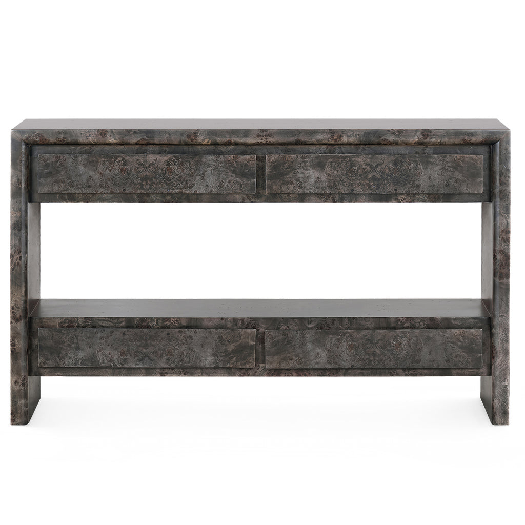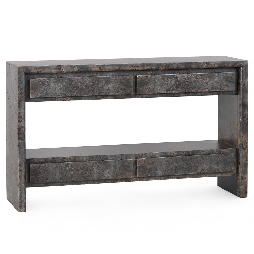 Fashioned with an exquisite Arabica Burlwood, the Beatrice Collection makes a striking statement in any room. This exquisite piece sits with presence on a platform base, and its four drawers provide ample storage. This piece, with its contemporary twist makes the ultimate console for your living room, dining room, or entryway.